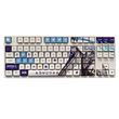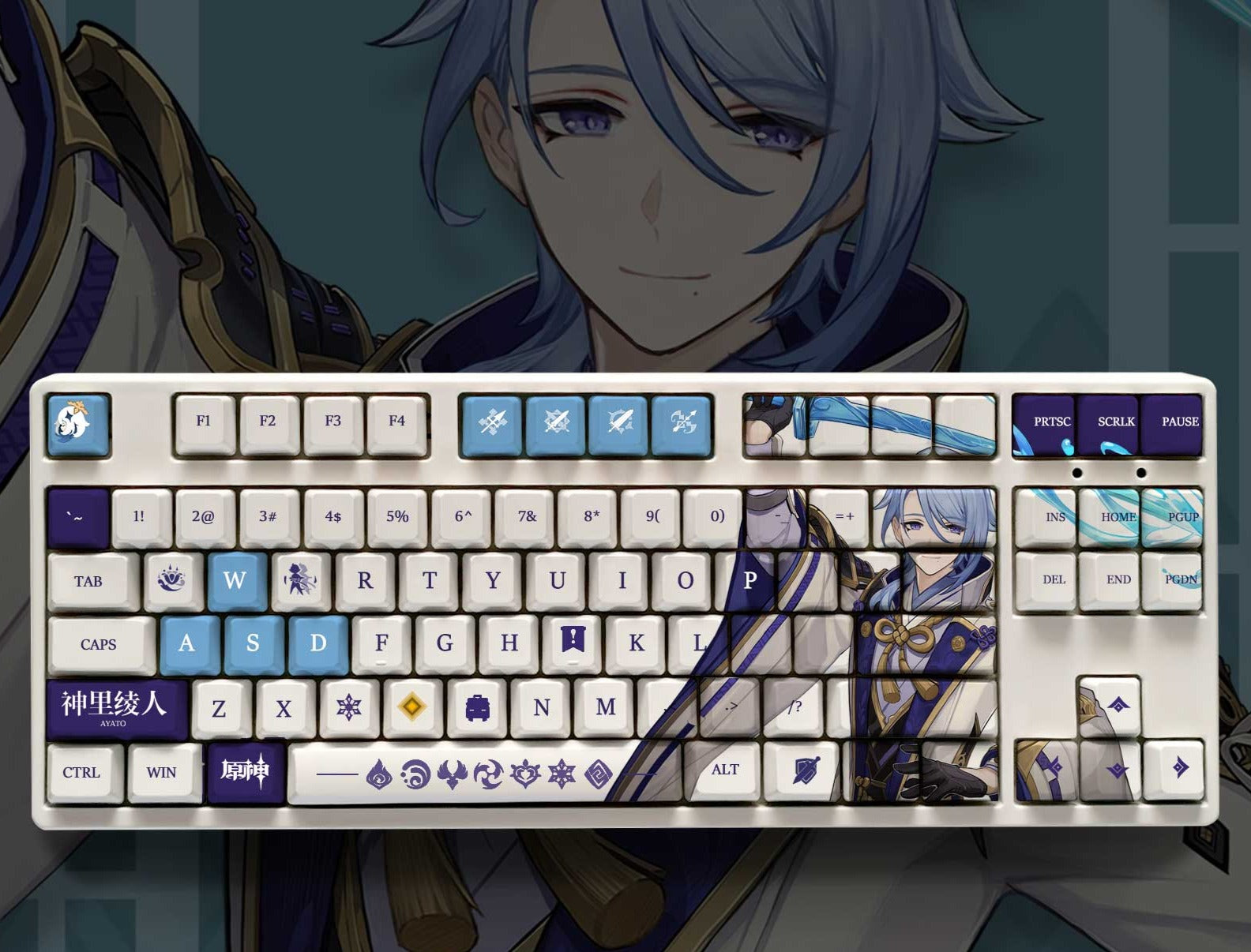 This mechanical keycaps set features various prints of Kamisato Ayato from the game "Genshin Impact" that are bound together with white and blue colouring.
