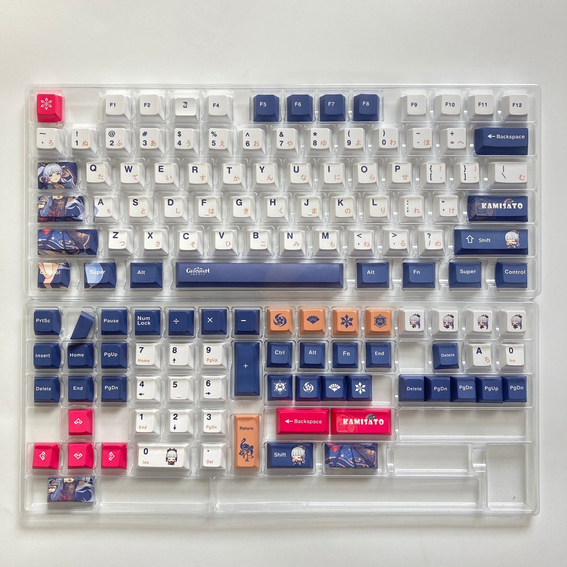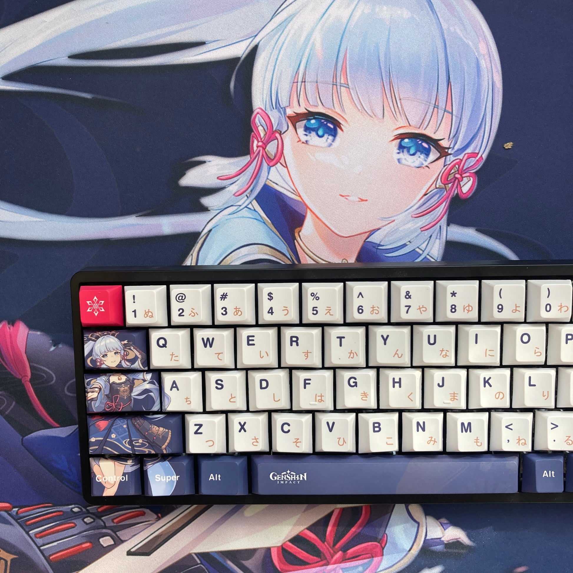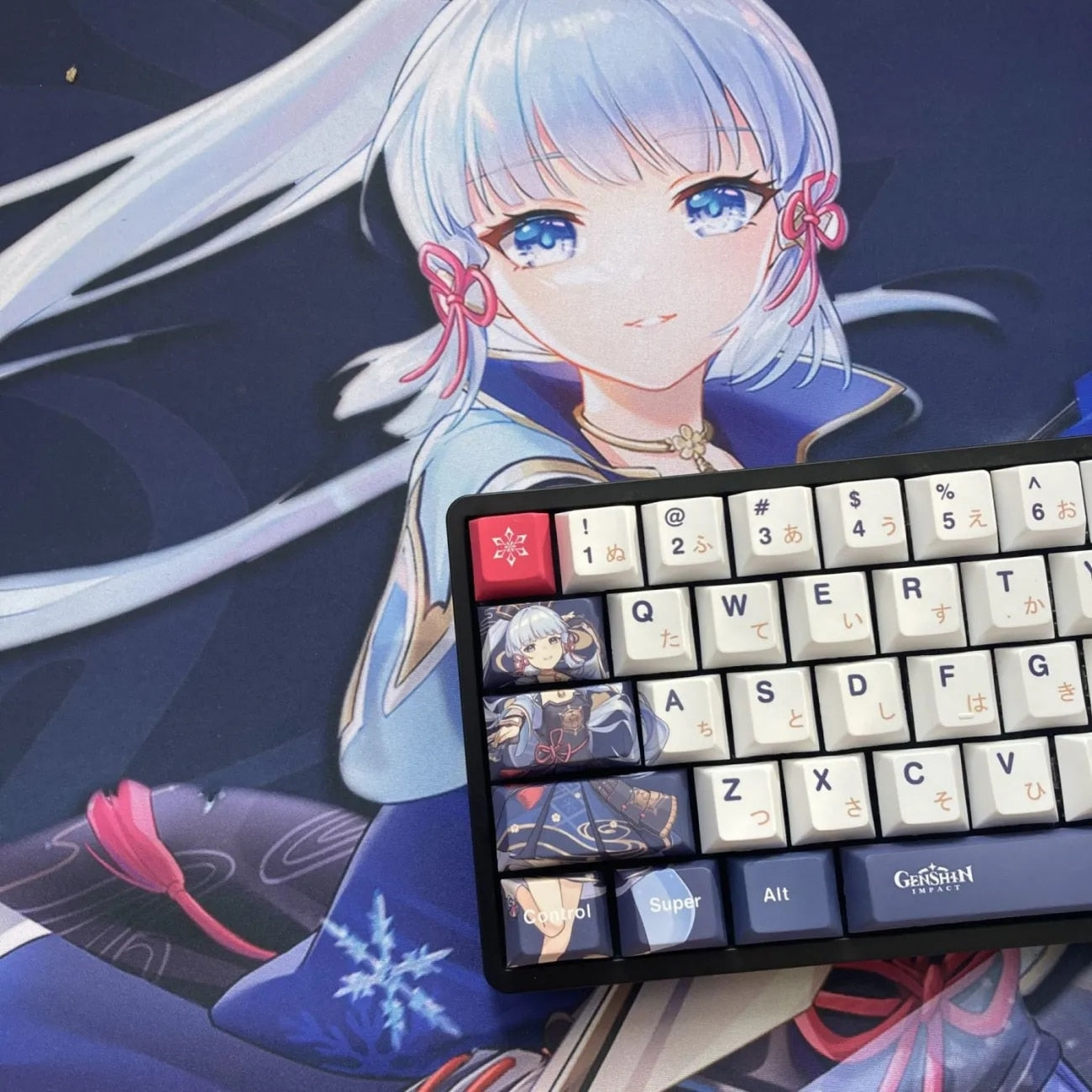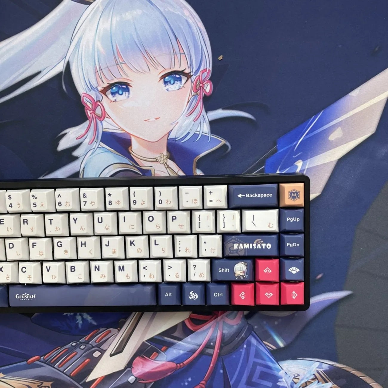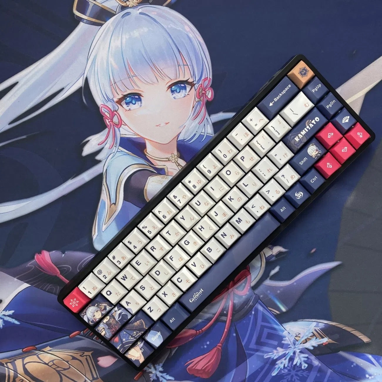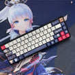 This mechanical keycaps set features various prints of Kamisato Ayaka from the game "Genshin Impact" that are bound together with blue, pink and white colouring.