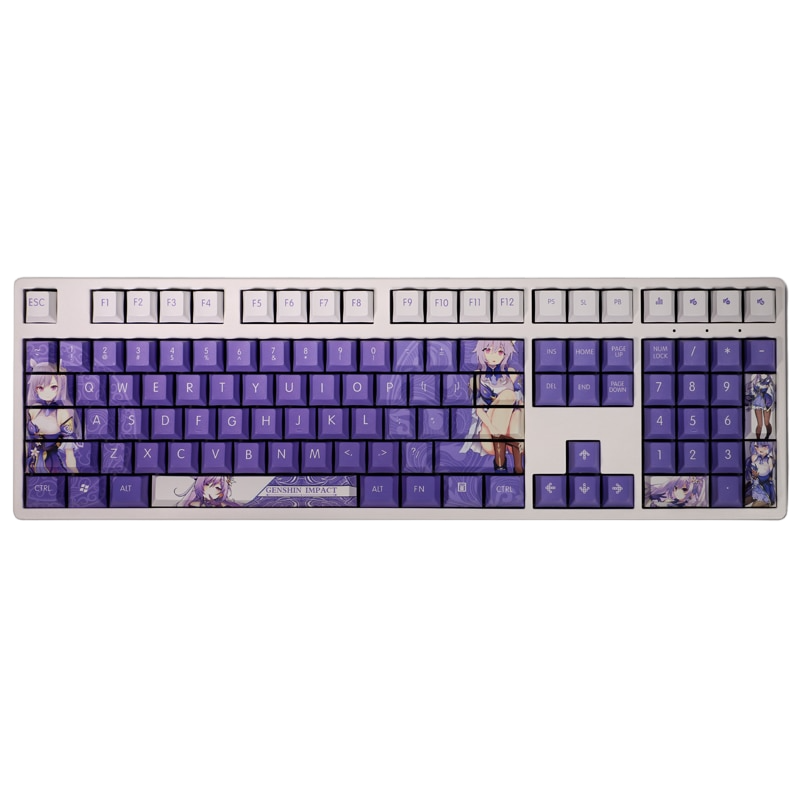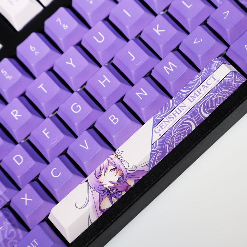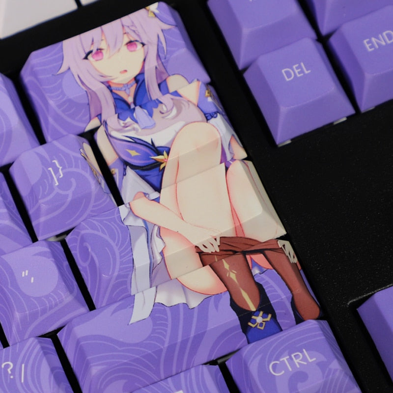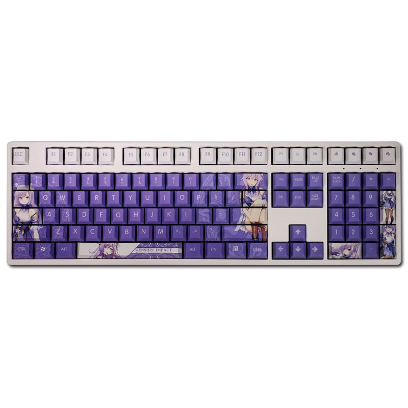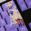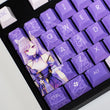 This mechanical keycaps set features various prints of Keqing from the game "Genshin Impact" that are bound together with purple colouring.