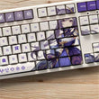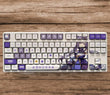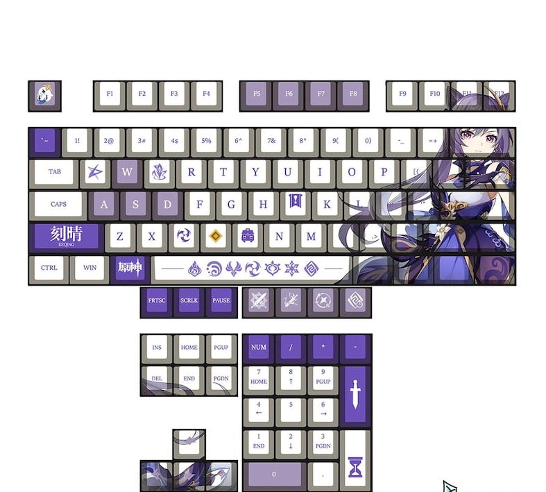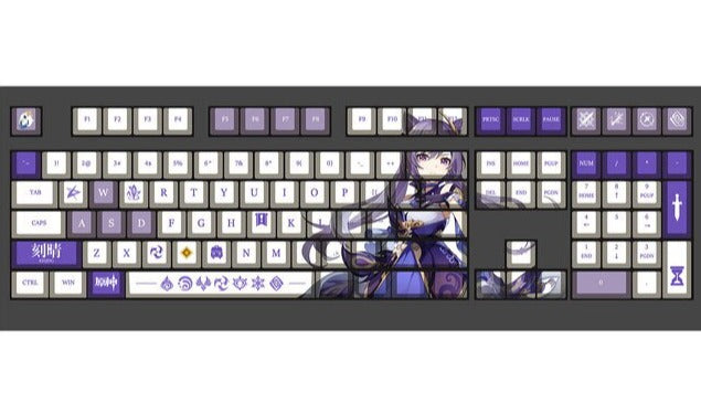 This mechanical keycaps set features various prints of Keqing from the game "Genshin Impact" that are bound together with white and purple colouring.