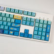 This mechanical keycaps set features various logos of the game "Genshin Impact" that are bound together with blue colouring.