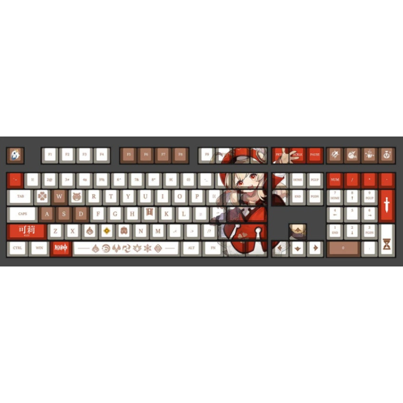 This mechanical keycaps set features various prints of Klee from the game "Genshin Impact" that are bound together with white and red colouring.