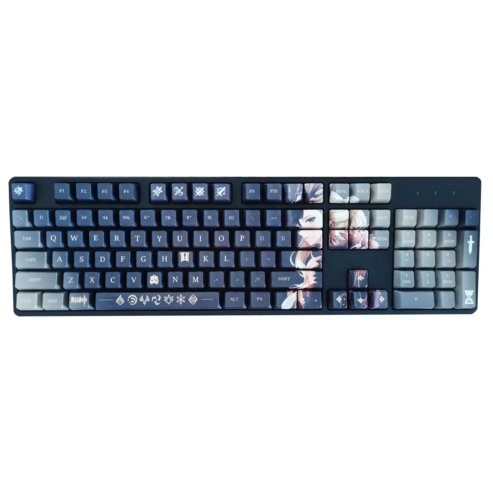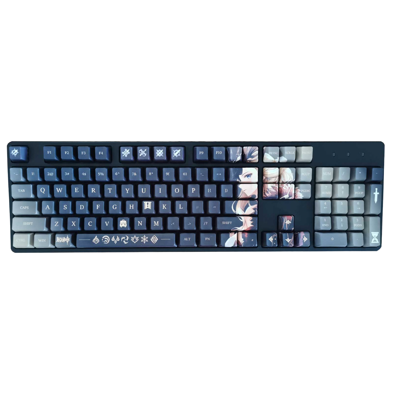 This mechanical keycaps set features various prints of La Signora from the game "Genshin Impact" that are bound together with blue colouring.