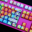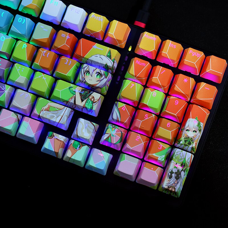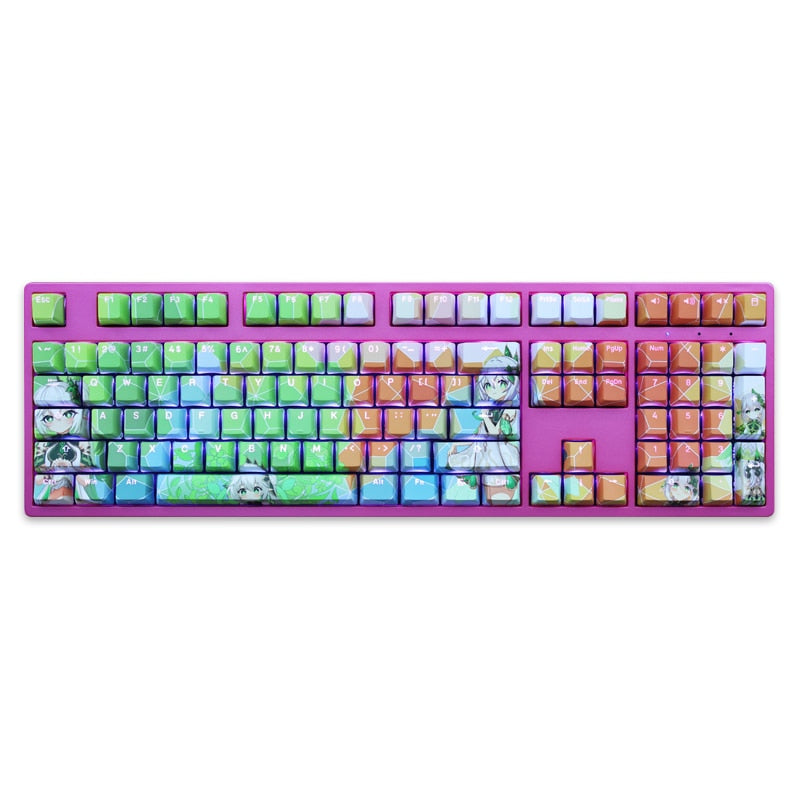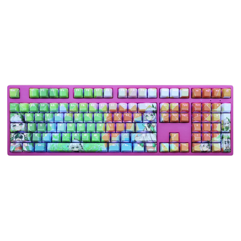 This mechanical keycaps set features various prints of Nahida from the Game "Genshin Impact" that are bound together with purple and black colouring, combined with Backlit keycaps, Nahida illuminates when LEDs pass through the keycaps.