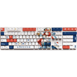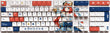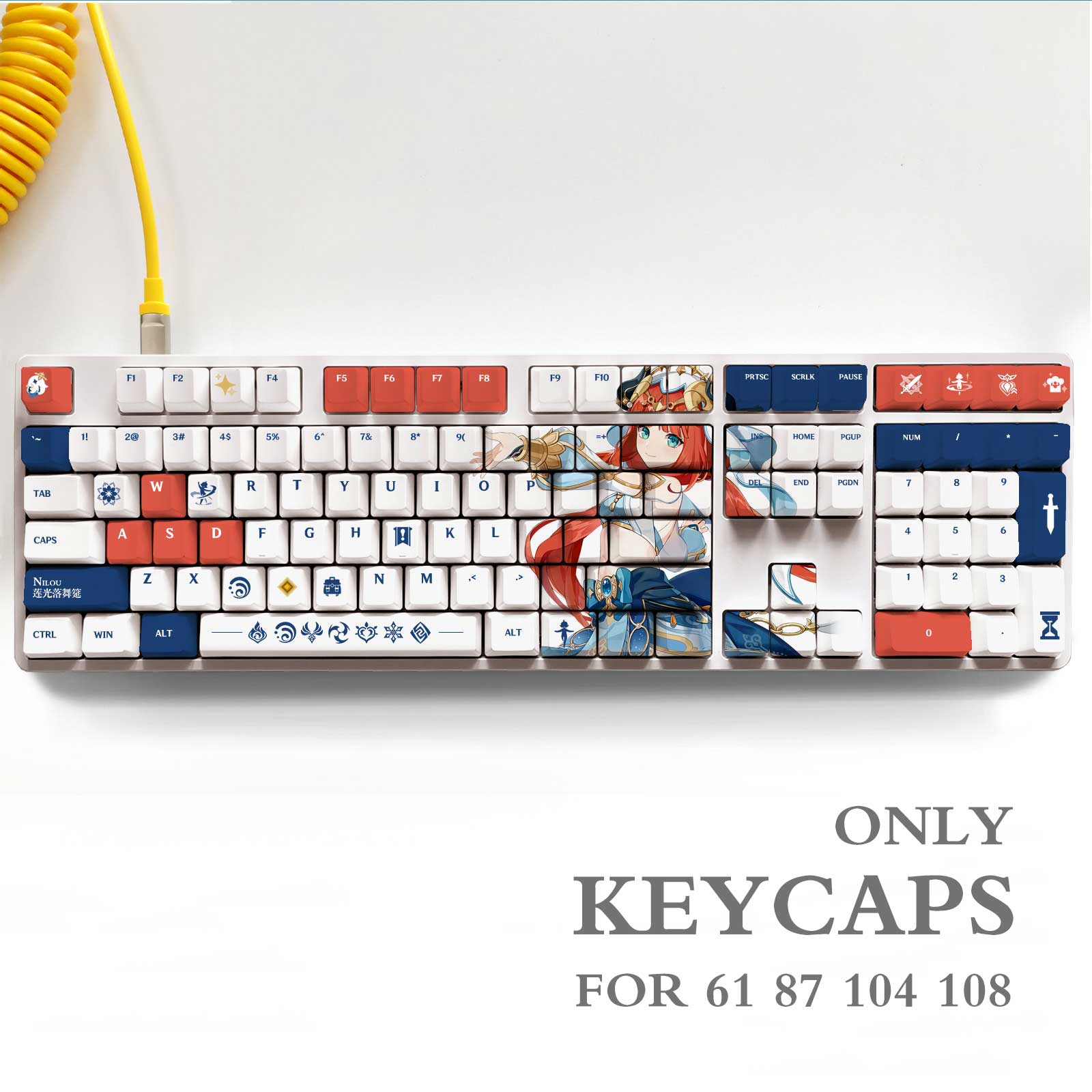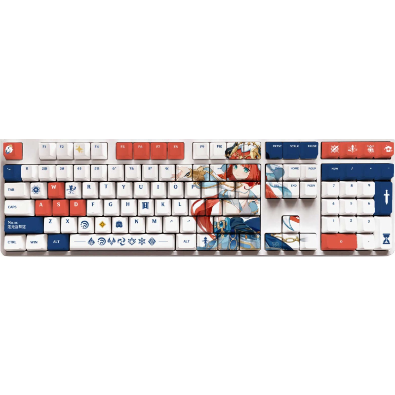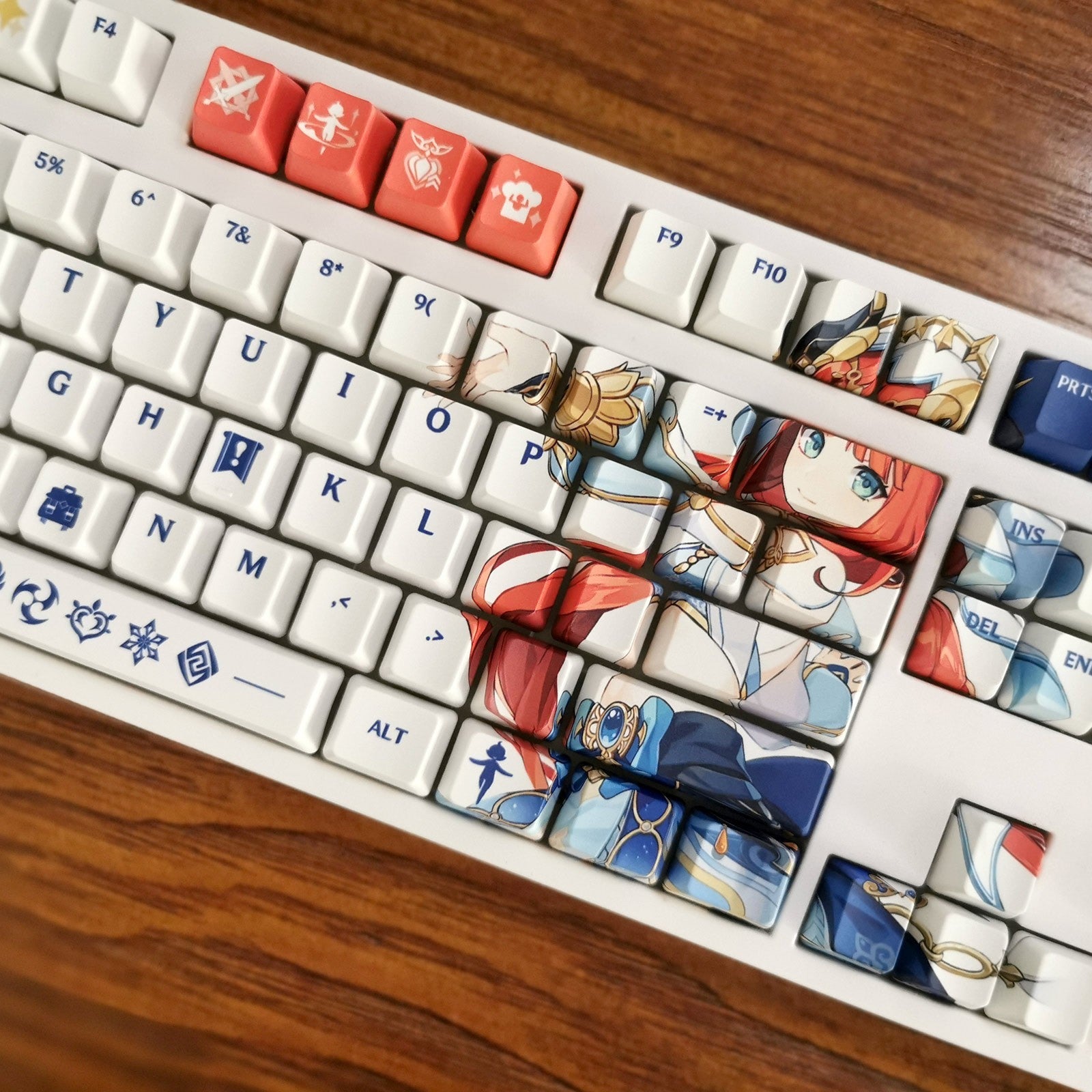 This mechanical keycaps set features various prints of Nilou from the game "Genshin Impact" that are bound together with white, blue and orange colouring.
