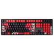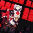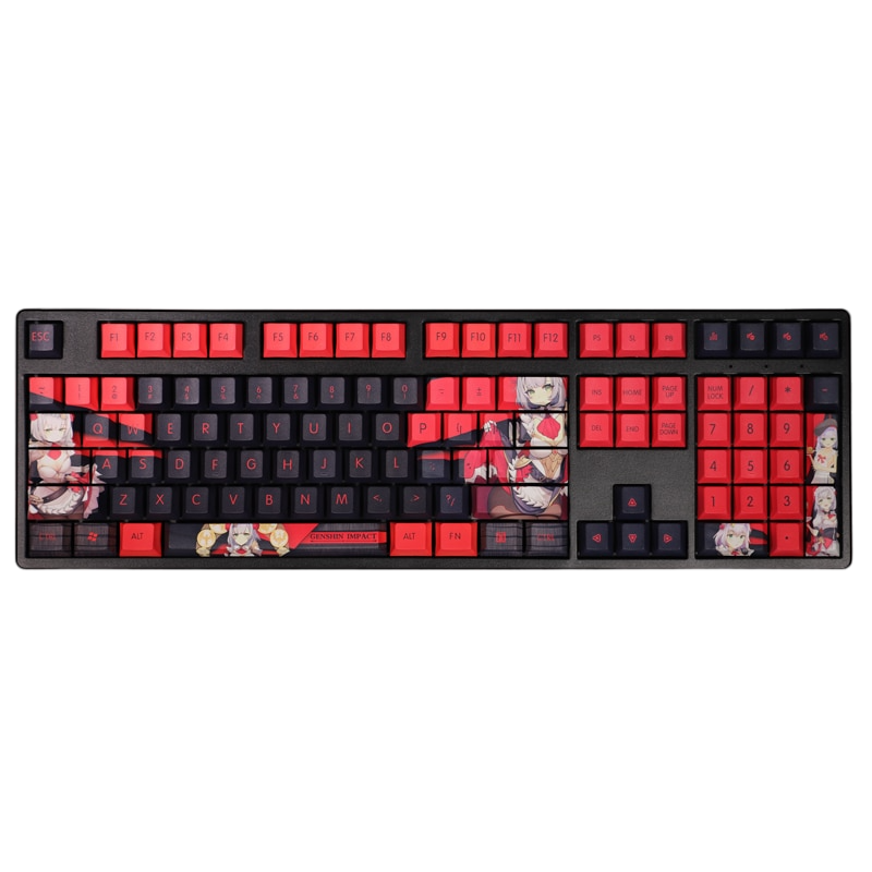 This mechanical keyboard features various prints of Noelle from the game "Genshin Impact" that are bound together with red and black colouring.