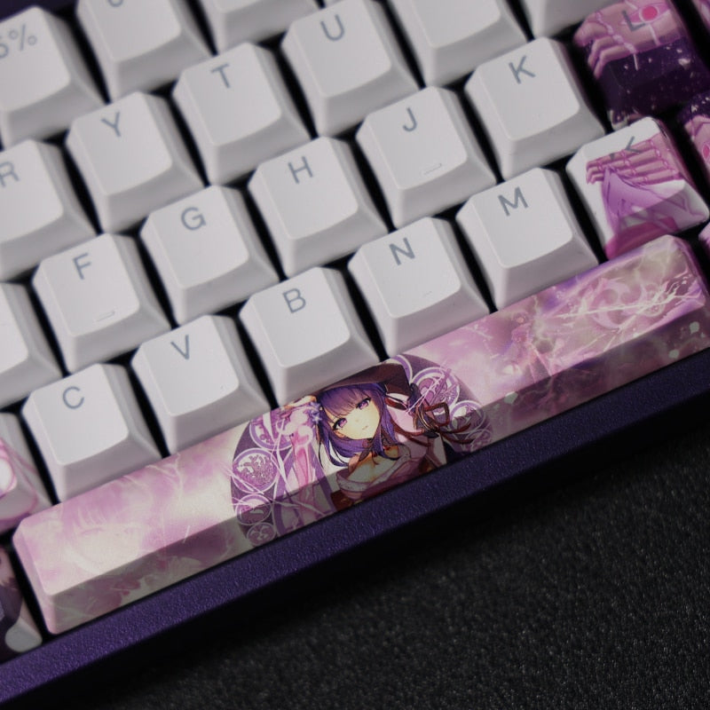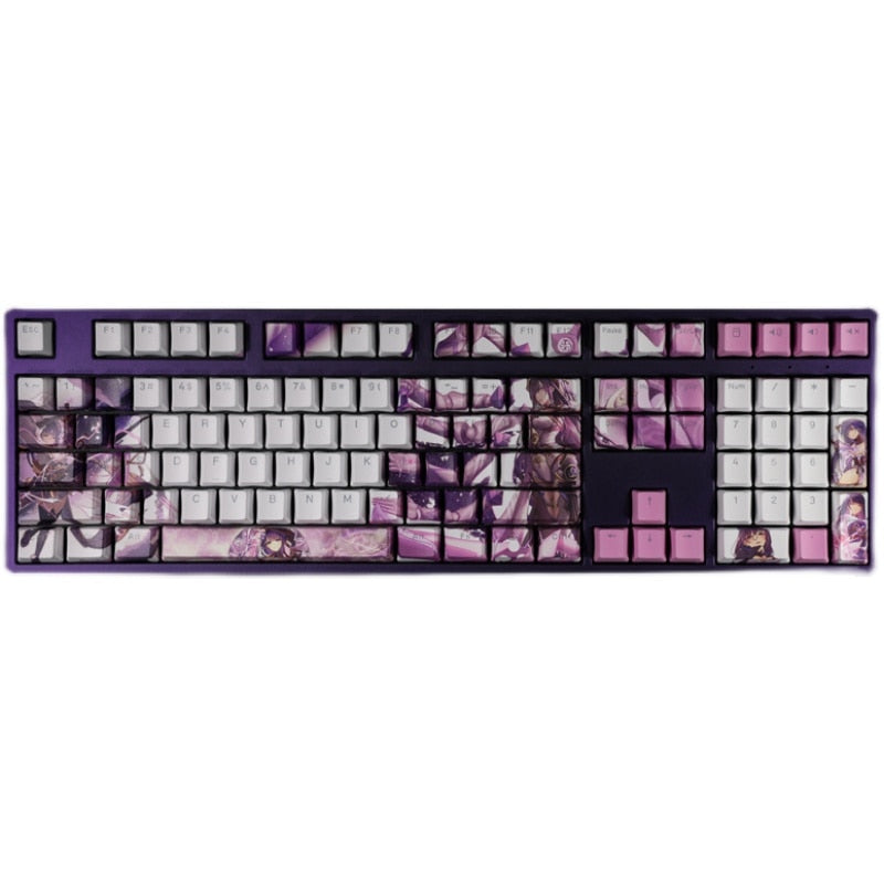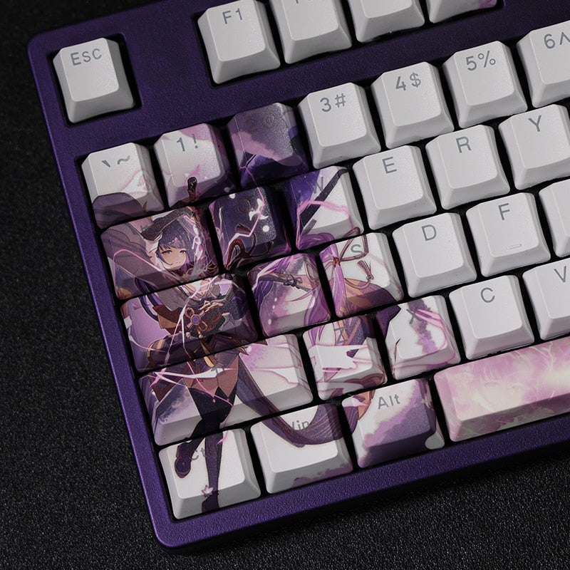 This mechanical keycaps set features various prints of Raiden Shogun from the Game "Genshin Impact" that are bound together with white and pink colouring, combined with Backlit keycaps, Raiden Shogun illuminates when LEDs pass through the keycaps.