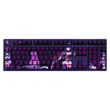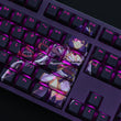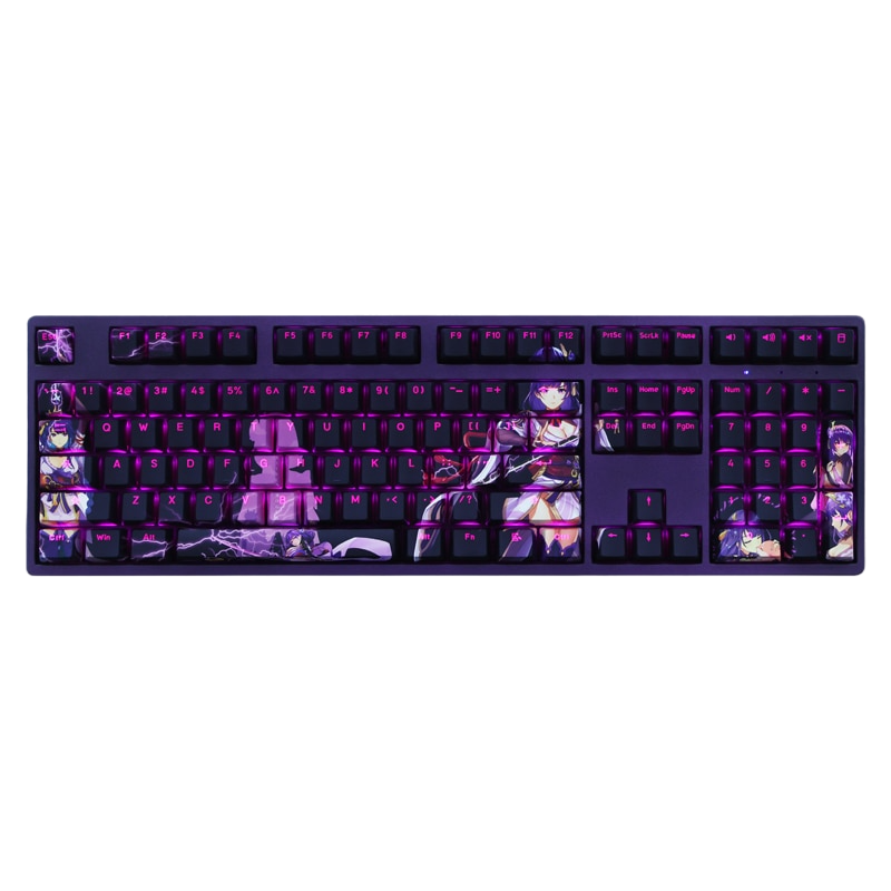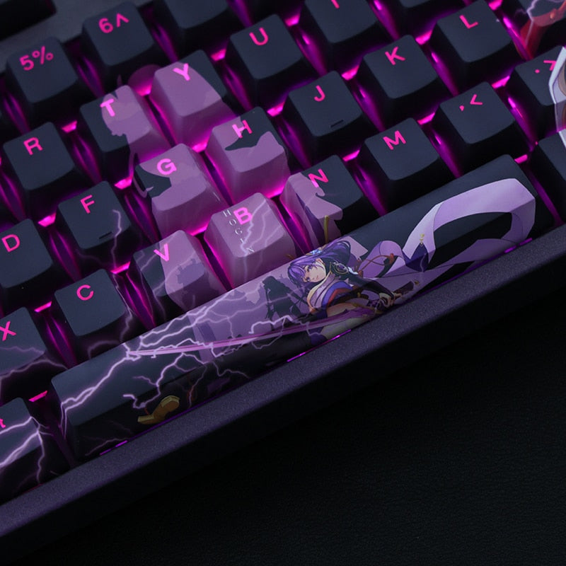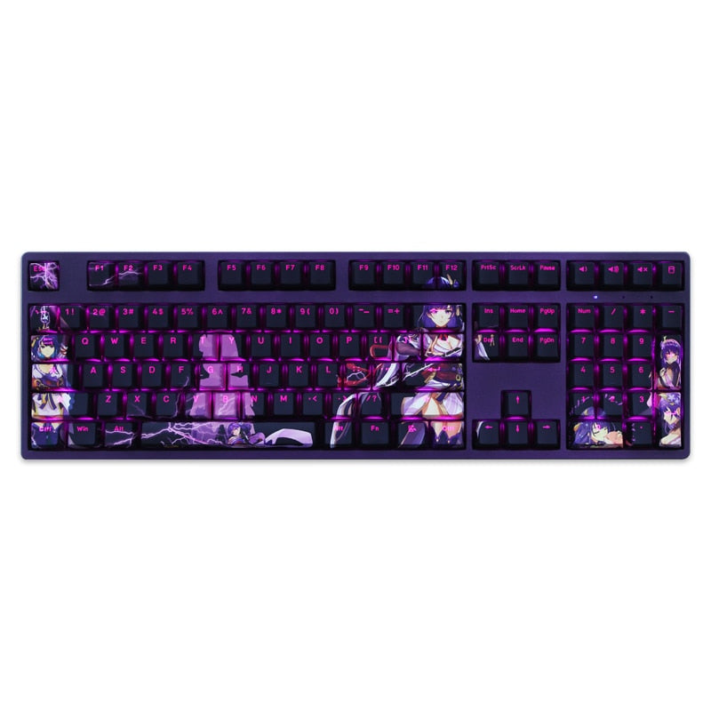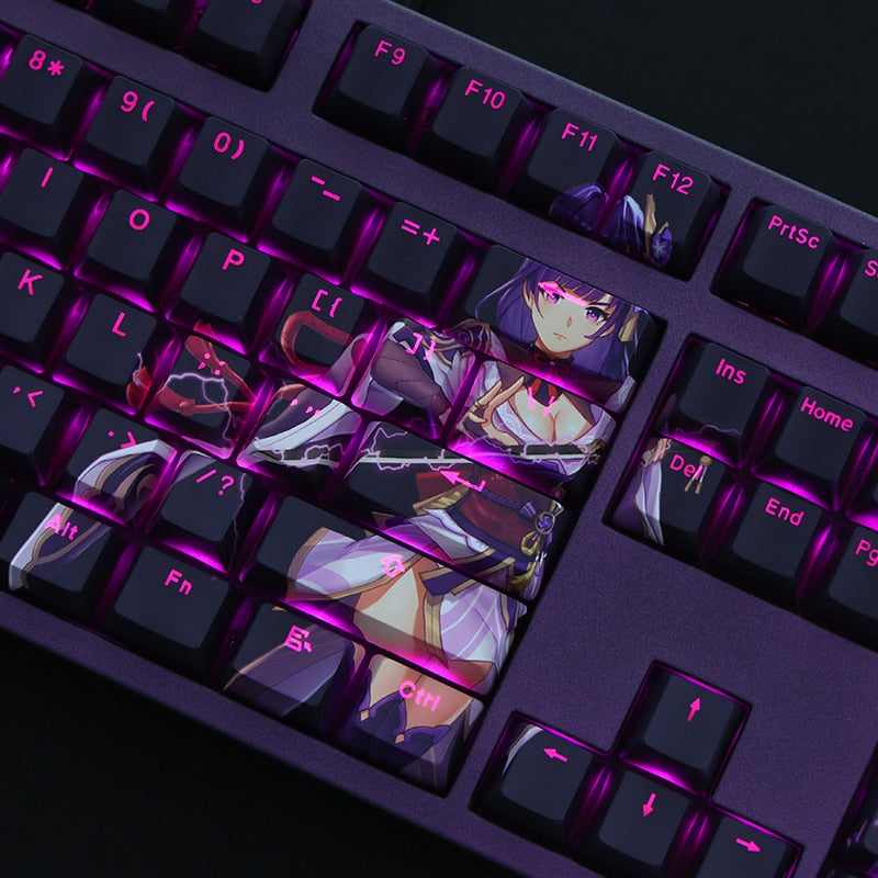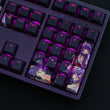 This mechanical keycaps set features various prints of Raiden Shogun from the Game "Genshin Impact" that are bound together with purple and black colouring, combined with Backlit keycaps, Raiden Shogun illuminates when LEDs pass through the keycaps.