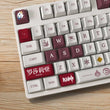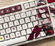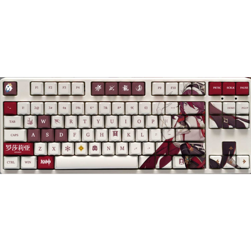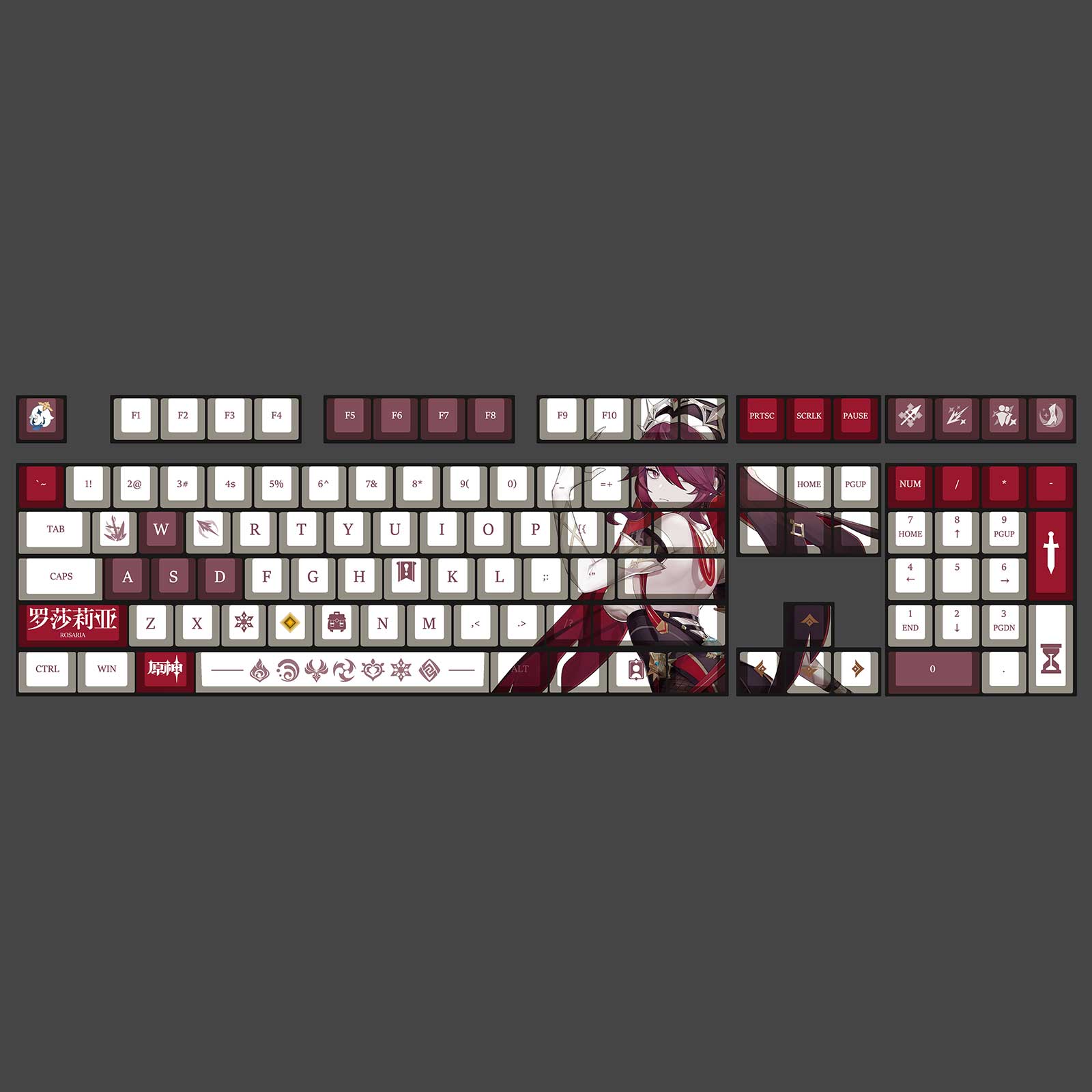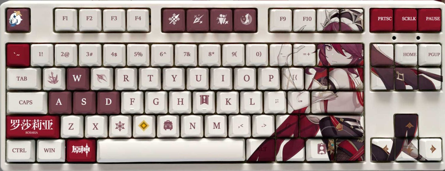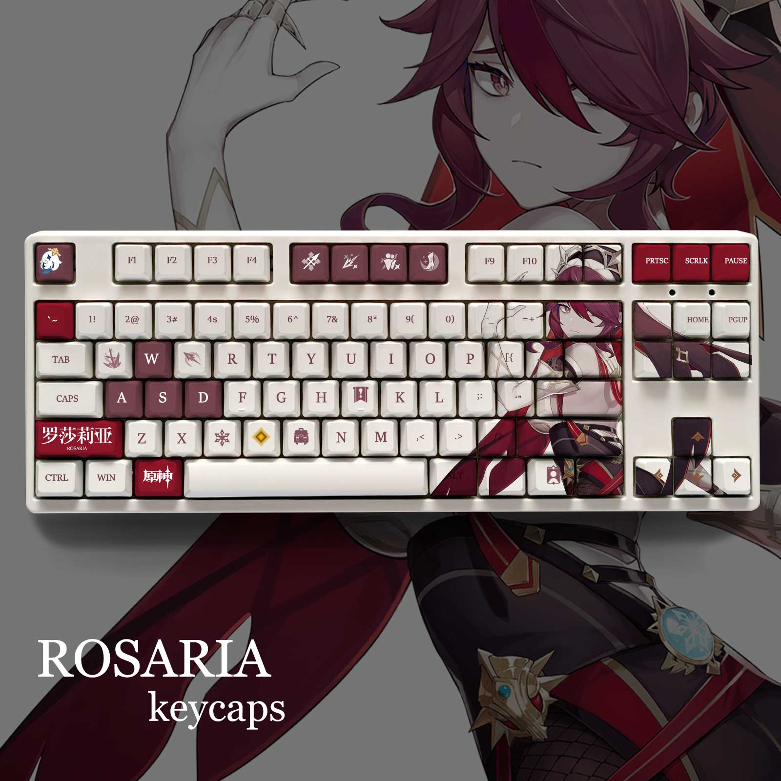 This mechanical keycaps set features various prints of Rosaria from the game "Genshin Impact" that are bound together with white and red colouring.