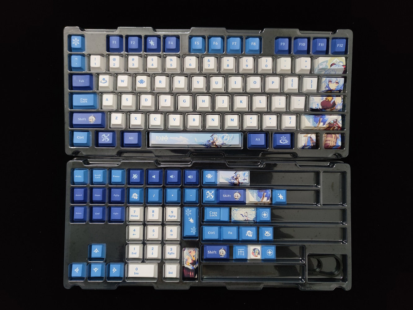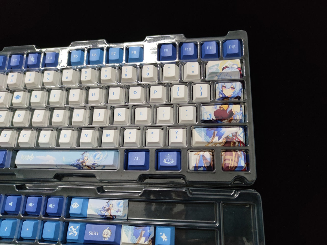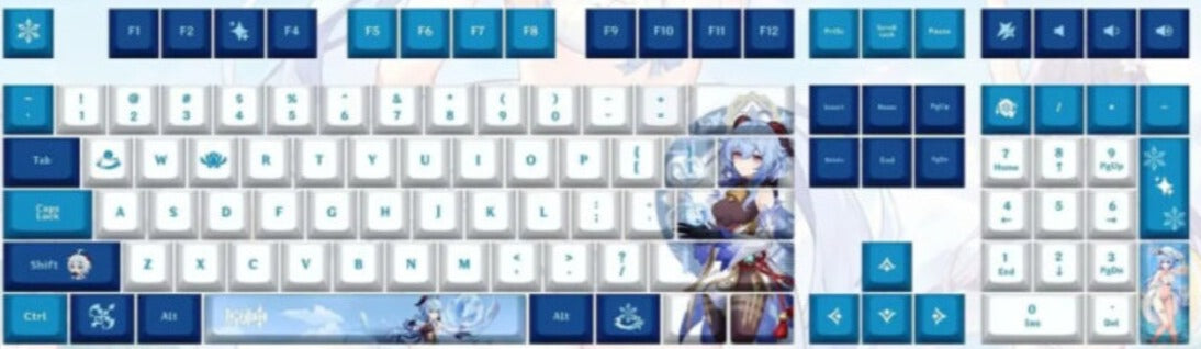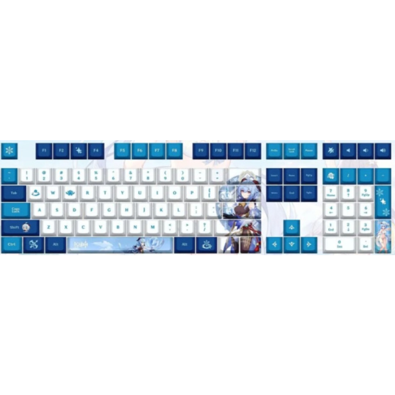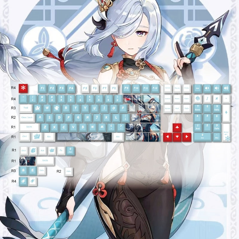 This mechanical keycaps set features various prints of Shenhe from the game "Genshin Impact" that are bound together with white and light blue colouring.