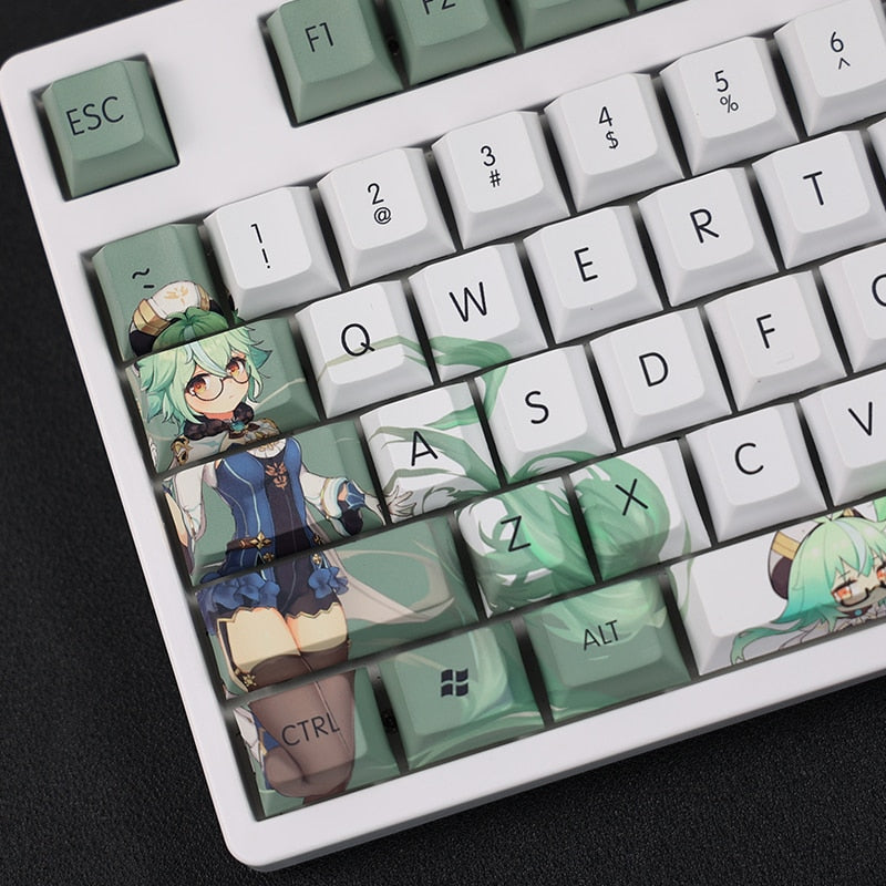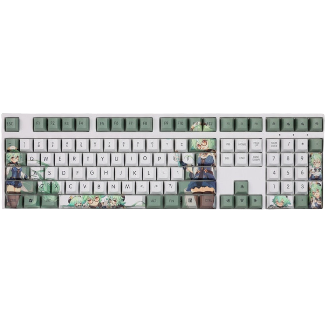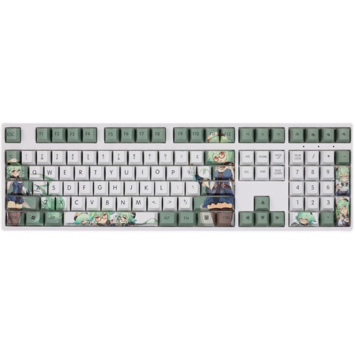This mechanical keycaps set features various prints of Sucrose from the game "Genshin Impact" that are bound together with green and white colouring.