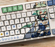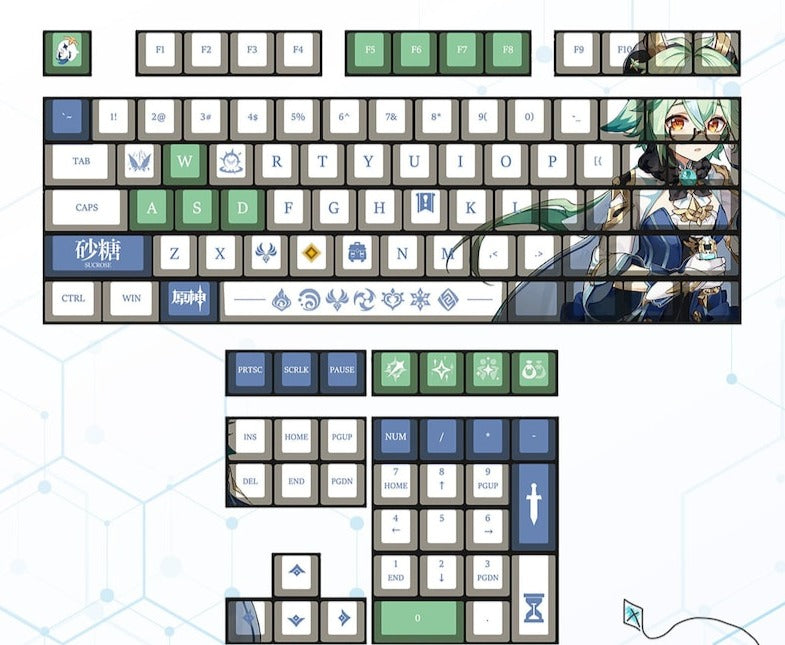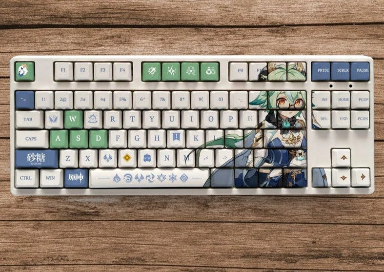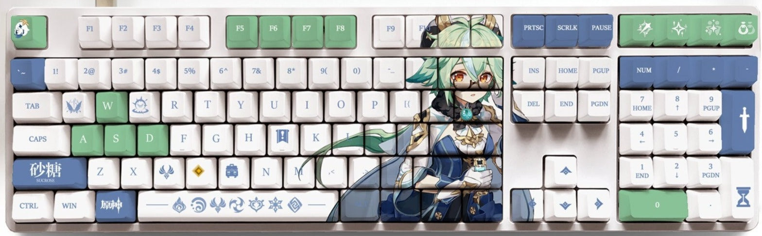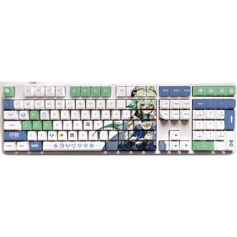 This mechanical keycaps set features various prints of Sucrose from the game "Genshin Impact" that are bound together with white, green and blue colouring.