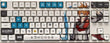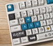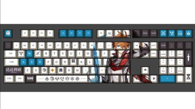 This mechanical keycaps set features various prints of Tartaglia from the game "Genshin Impact" that are bound together with white and blue colouring.