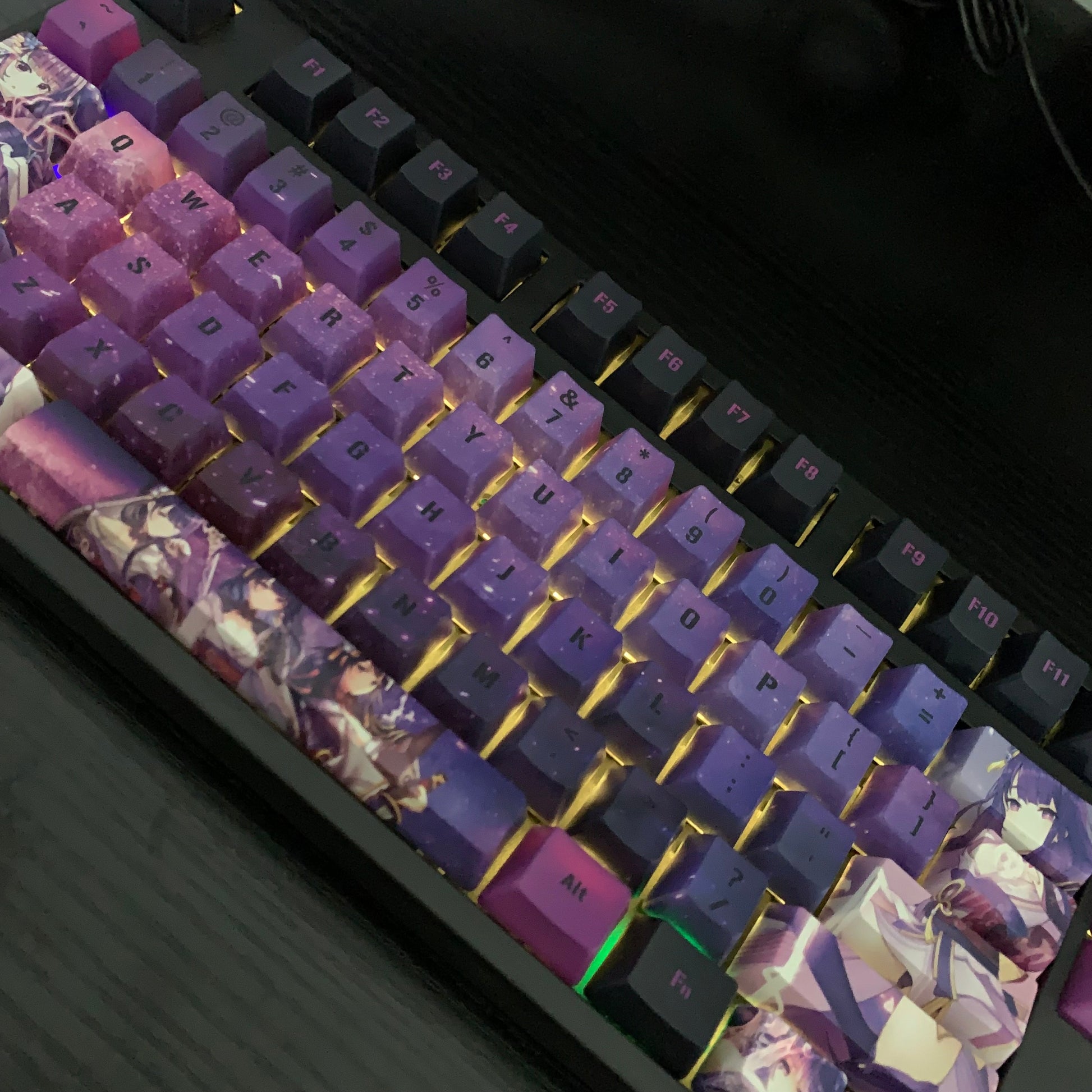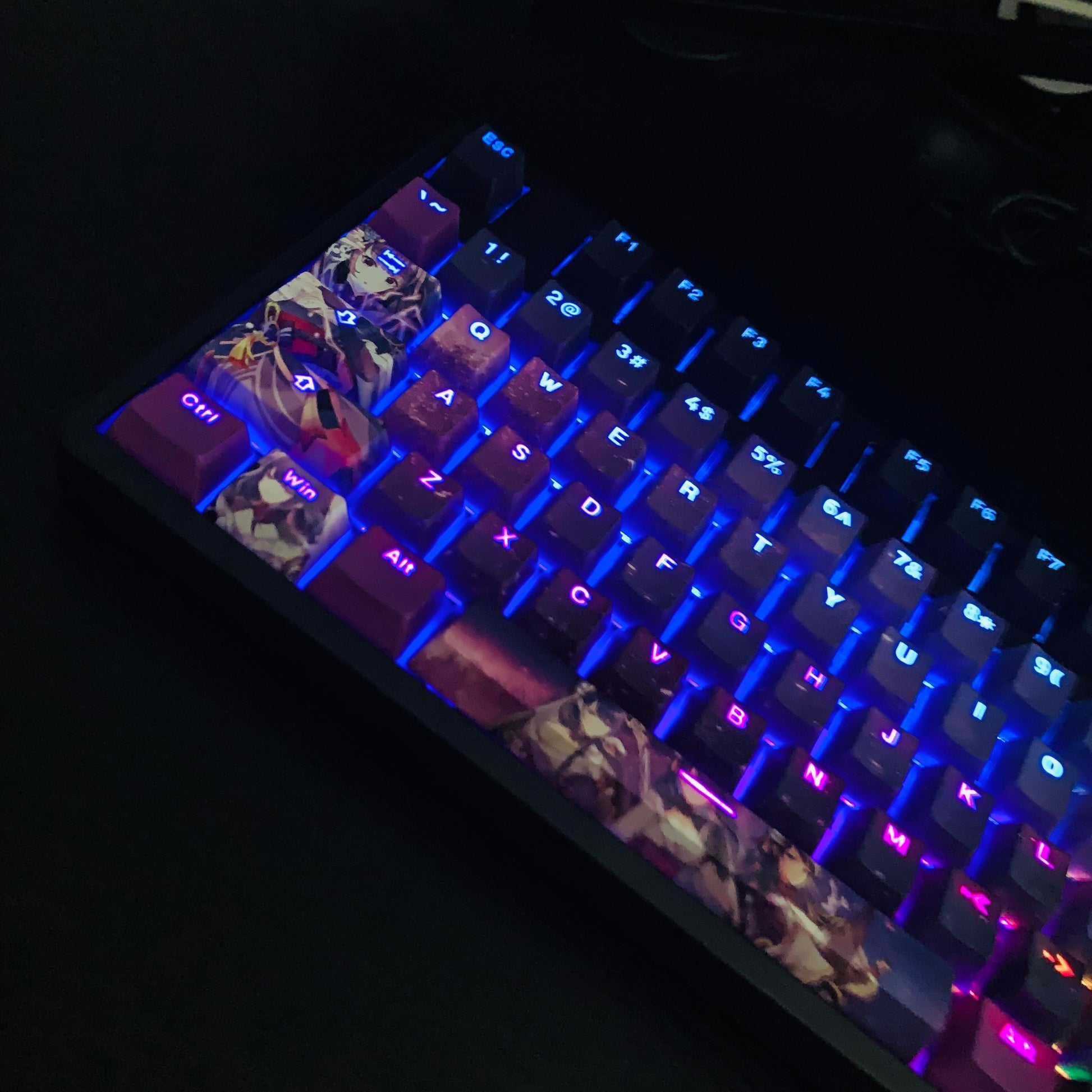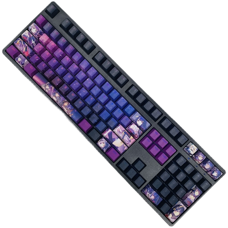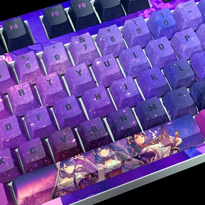 This mechanical keycaps set features various prints of Thunder General from the Game "Genshin Impact" that are bound together with blue and pink colouring, combined with Backlit keycaps, Thunder General illuminates when LEDs pass through the keycaps.