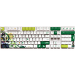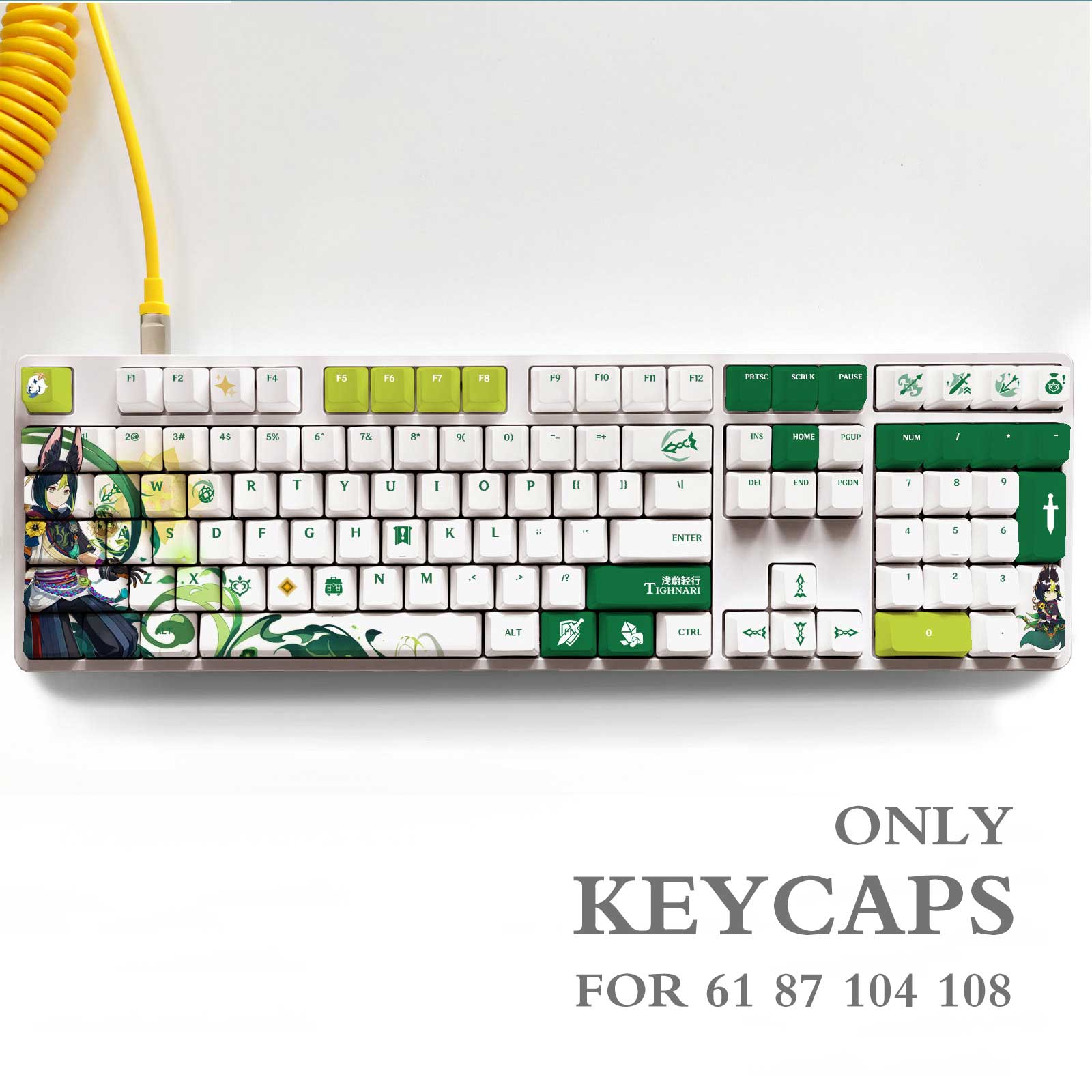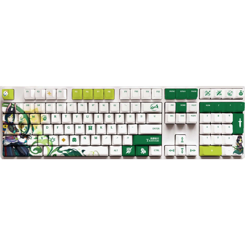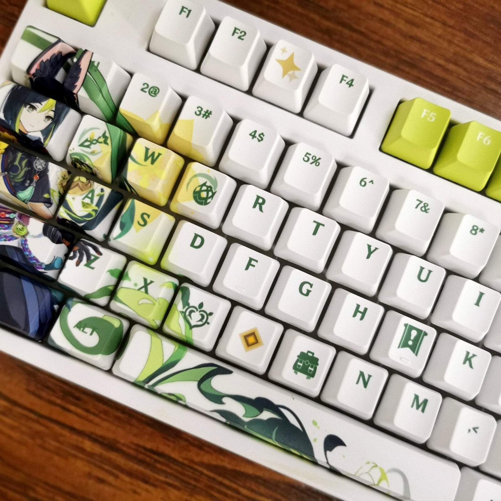 This mechanical keycaps set features various prints of Tighnari from the game "Genshin Impact" that are bound together with white and green colouring.
