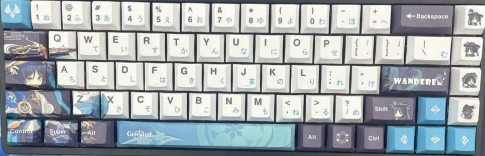 This mechanical keycaps set features various prints of Wanderer from the game "Genshin Impact" that are bound together with white and blue colouring.