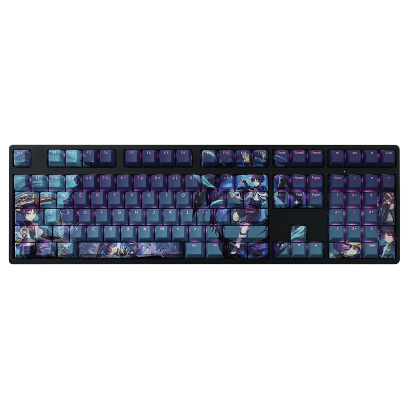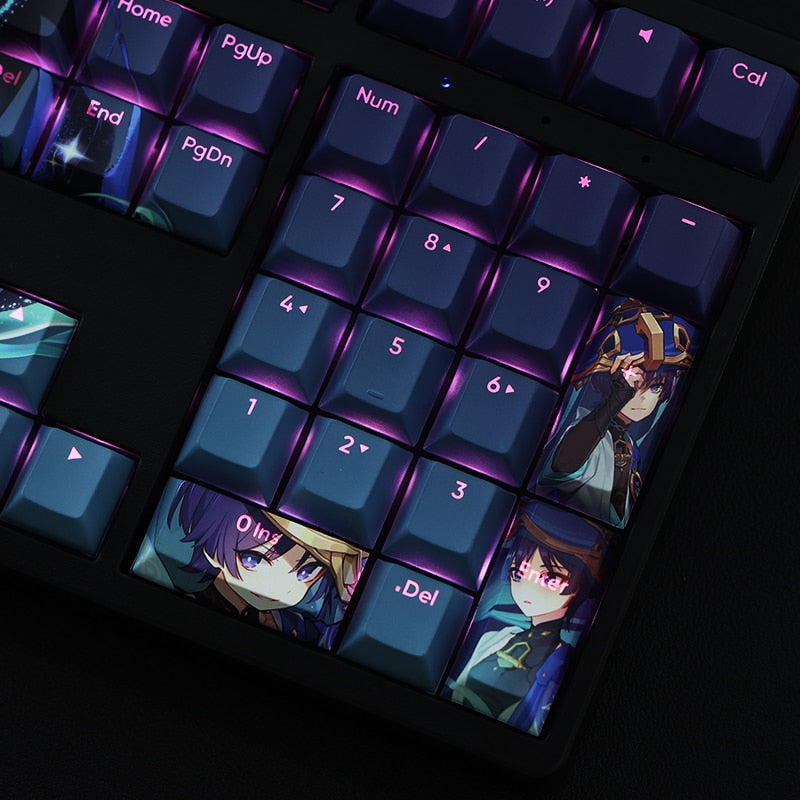 This mechanical keycaps set features various prints of Wanderer from the Game "Genshin Impact" that are bound together with blue and black colouring, combined with Backlit keycaps, Wanderer illuminates when LEDs pass through the keycaps.