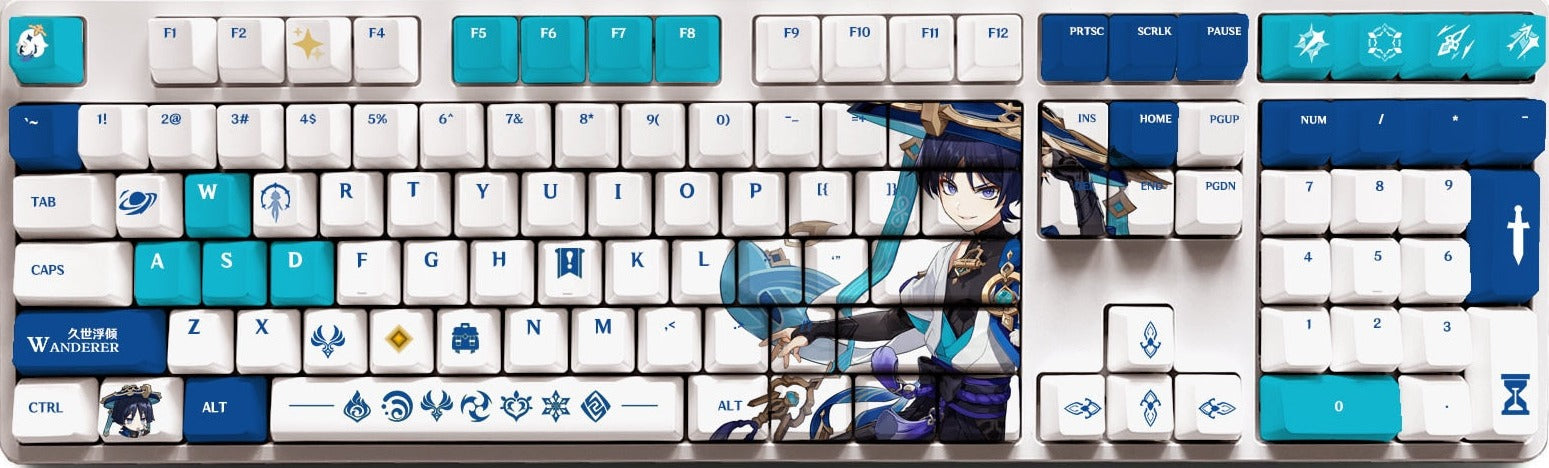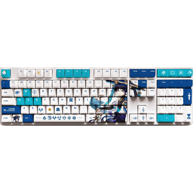 This mechanical keycaps set features various prints of Wanderer from the game "Genshin Impact" that are bound together with white and blue colouring.