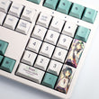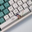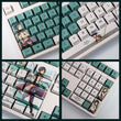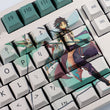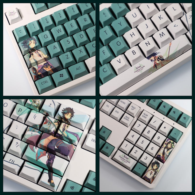 This mechanical keycaps set features various prints of Xiao from the game "Genshin Impact" that are bound together with dark green and white colouring.