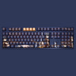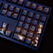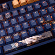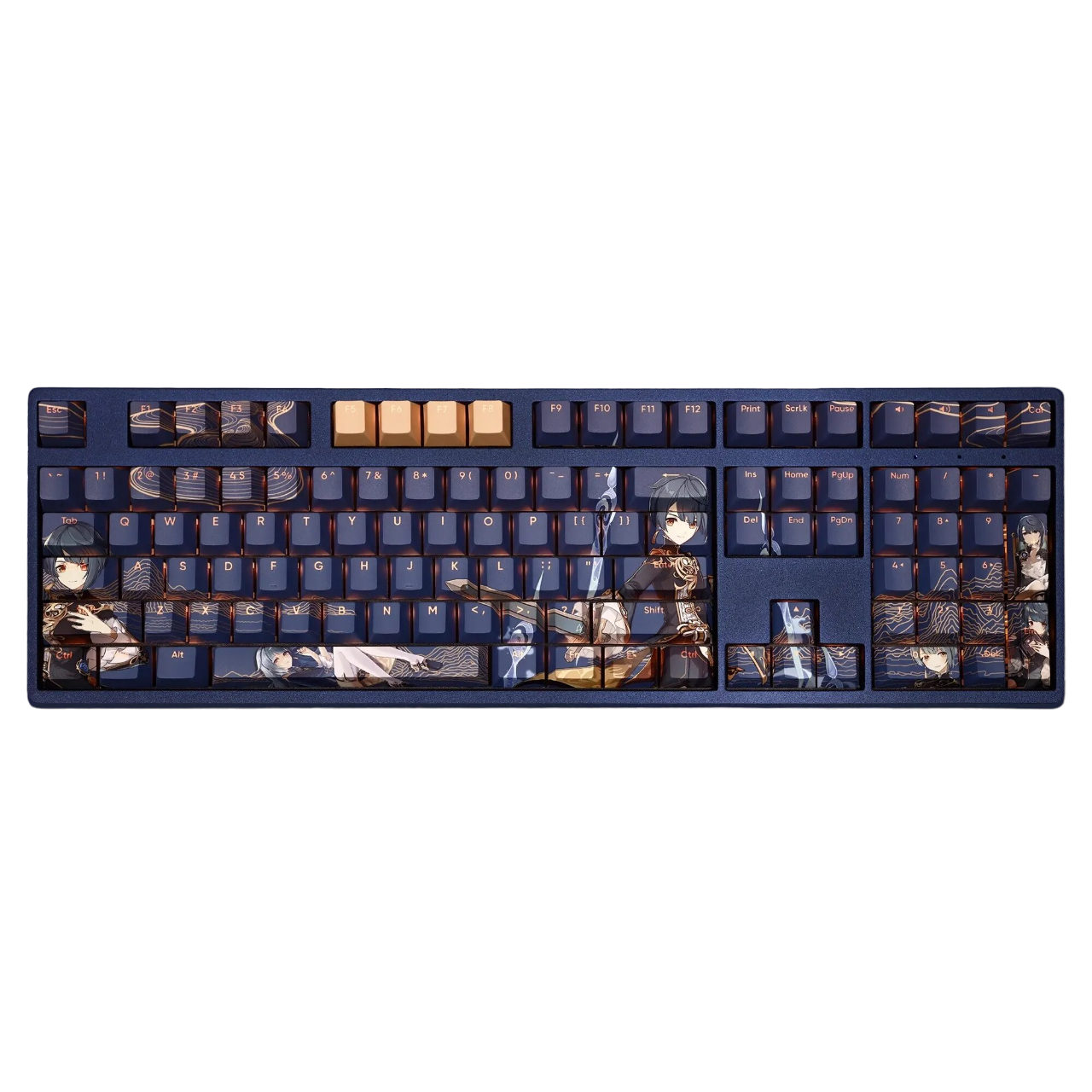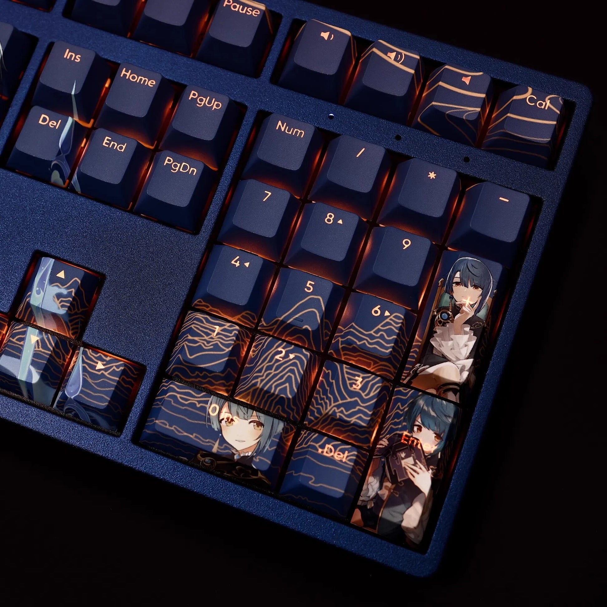 This mechanical keycaps set features various prints of Xingqiu from the Game "Genshin Impact" that are bound together with blue and orange colouring, combined with Backlit keycaps, Xingqiu illuminates when LEDs pass through the keycaps.