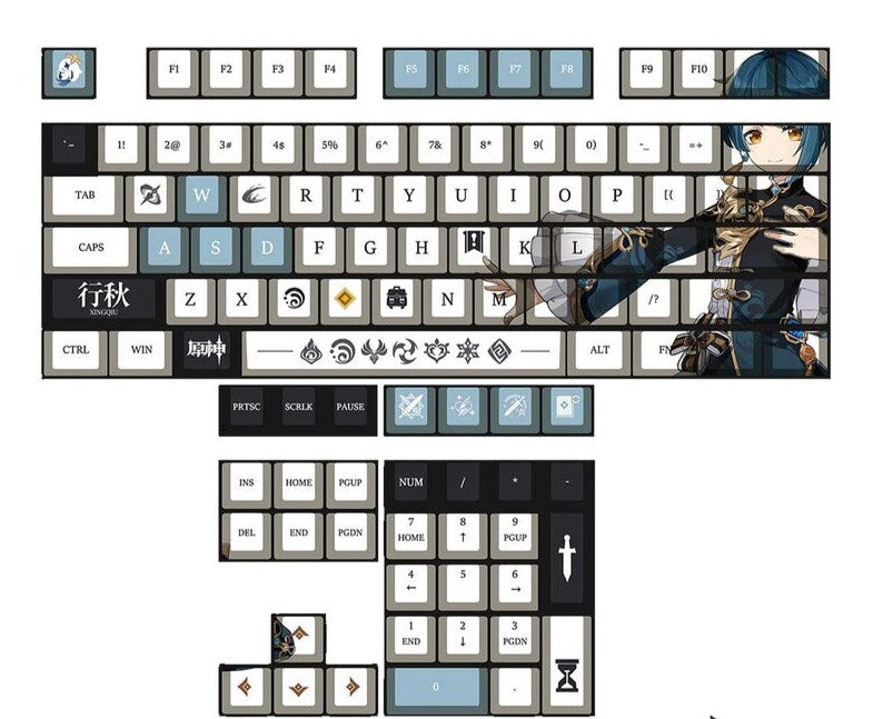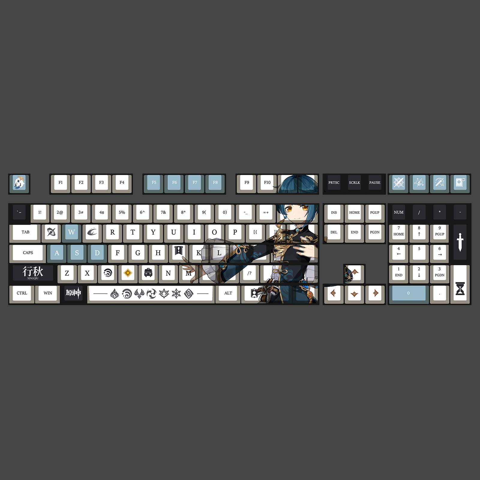 This mechanical keycaps set features various prints of Xingqiu from the game "Genshin Impact" that are bound together with white and light blue colouring.