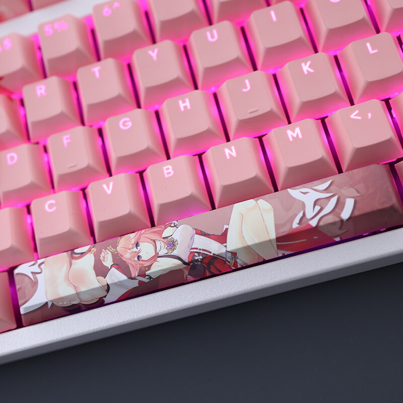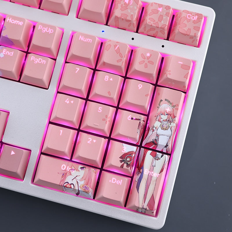 This mechanical keycaps set features various prints of Yae Miko from the game "Genshin Impact" that are bound together with pink colouring, combined with Backlit keycaps, Yae Miko illuminates when LEDs pass through the keycaps.