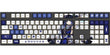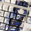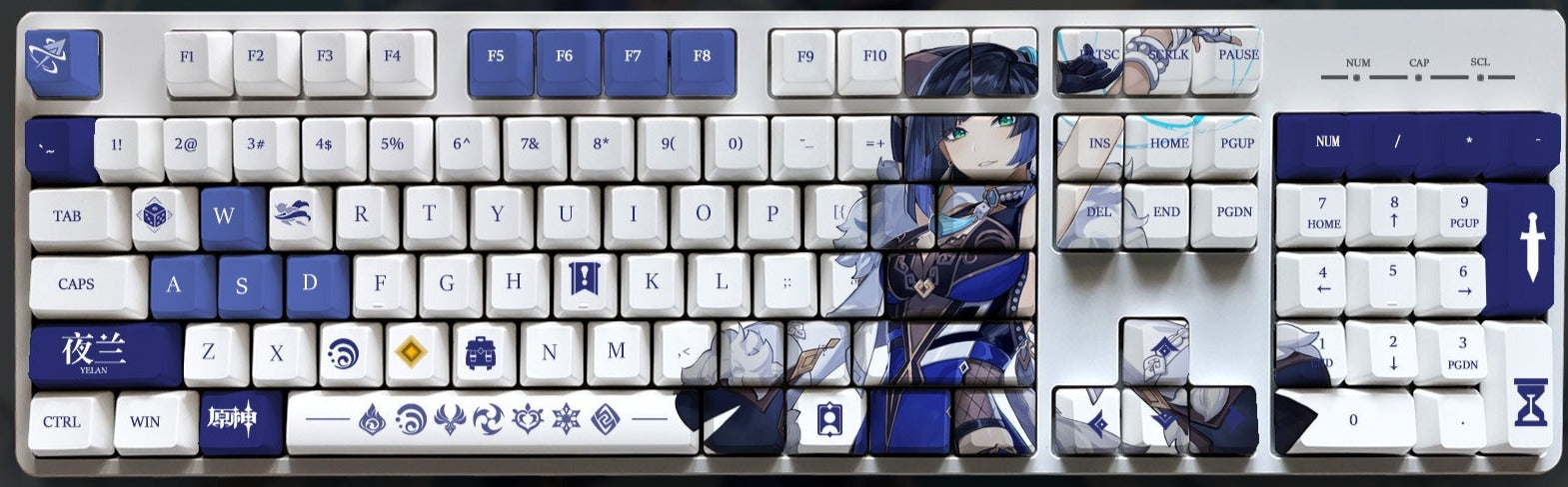 This mechanical keycaps set features various prints of Yelan from the game "Genshin Impact" that are bound together with white and blue colouring.