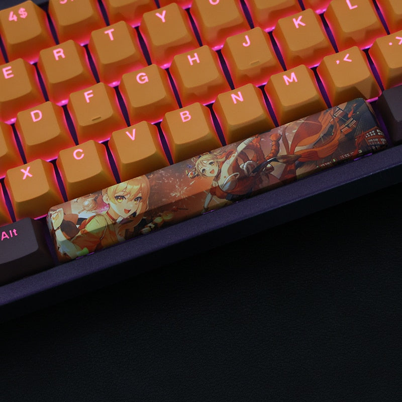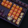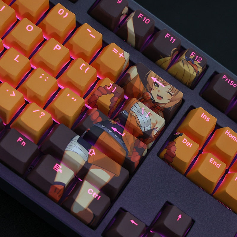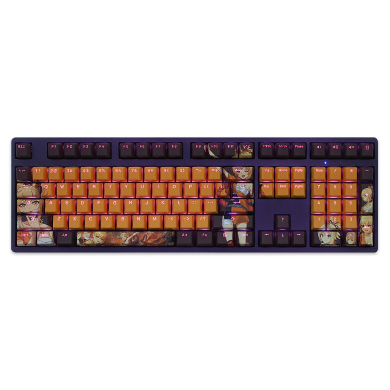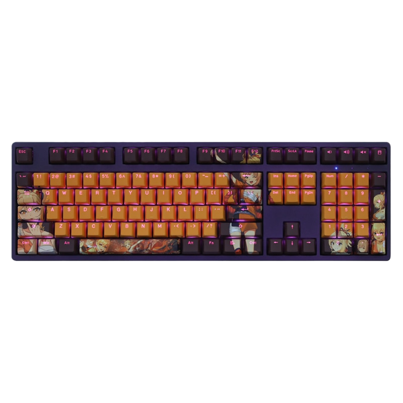 This mechanical keycaps set features various prints of Yoimiya from the Game "Genshin Impact" that are bound together with orange and blackcolouring, combined with Backlit keycaps, Yoimiya illuminates when LEDs pass through the keycaps.