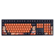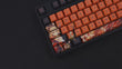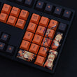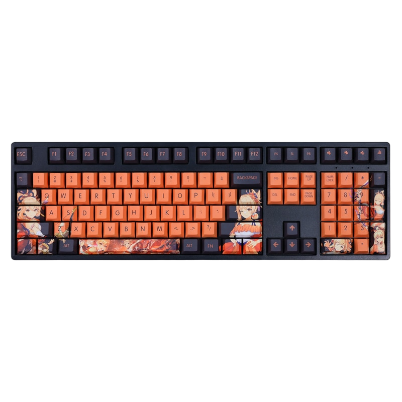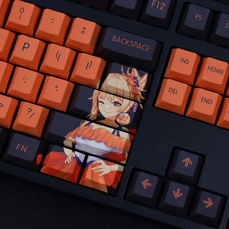This mechanical keycaps set features various prints of Yoimiya from the game "Genshin Impact" that are bound together with orange and black colouring.