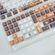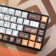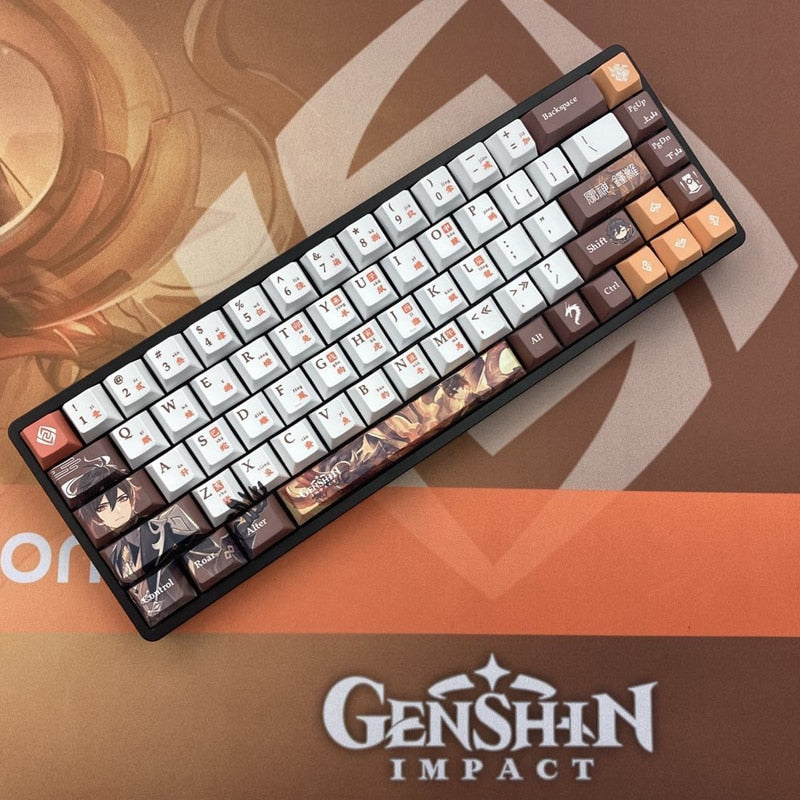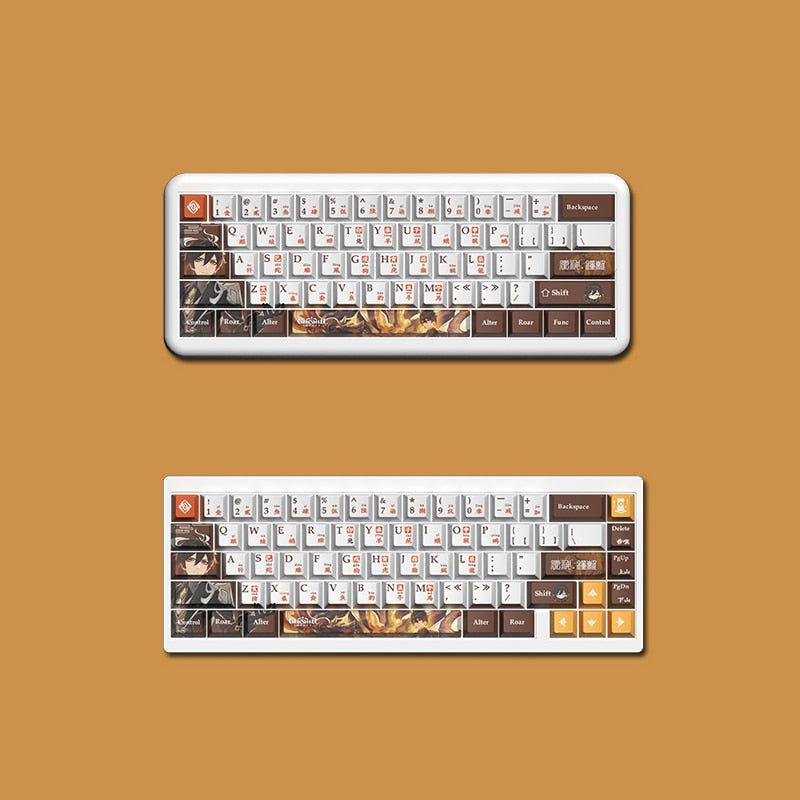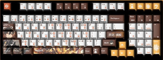 This mechanical keycaps set features various prints of Zhongli from the game "Genshin Impact" that are bound together with brown and yellow colouring.