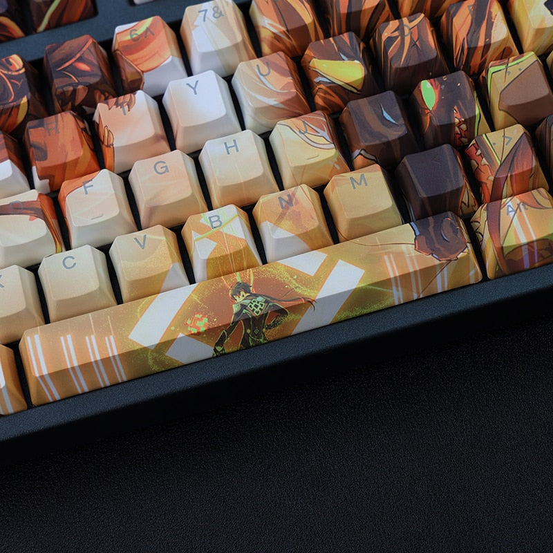 This mechanical keycaps set features various prints of Zhongli from the Game "Genshin Impact" that are bound together with brown and orange colouring, combined with Backlit keycaps, Zhongli illuminates when LEDs pass through the keycaps.