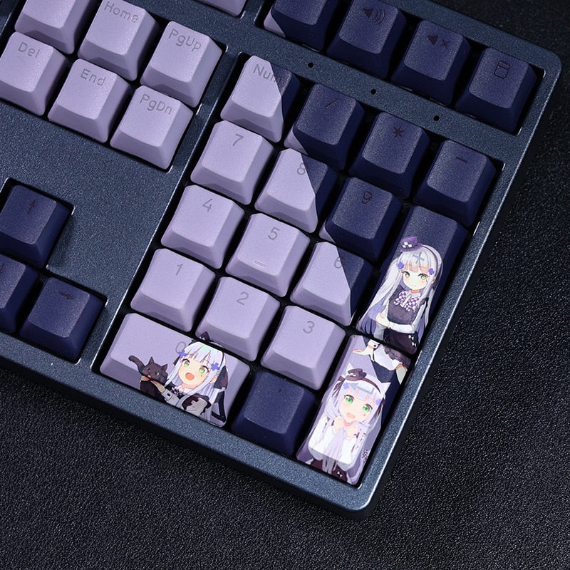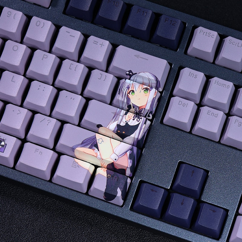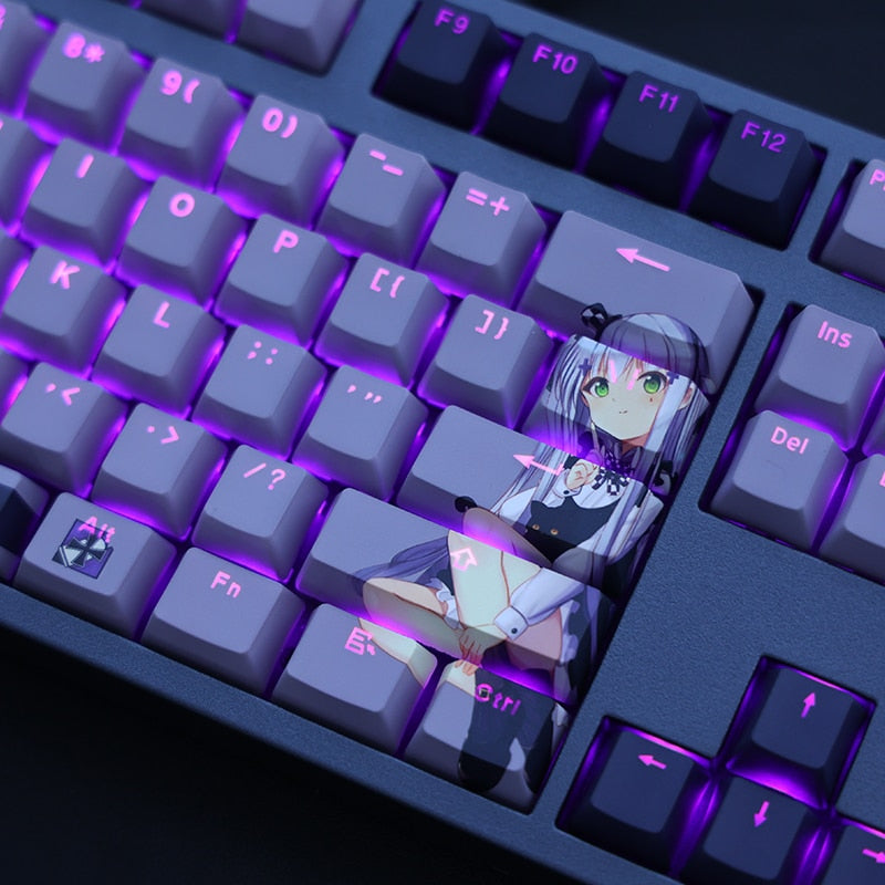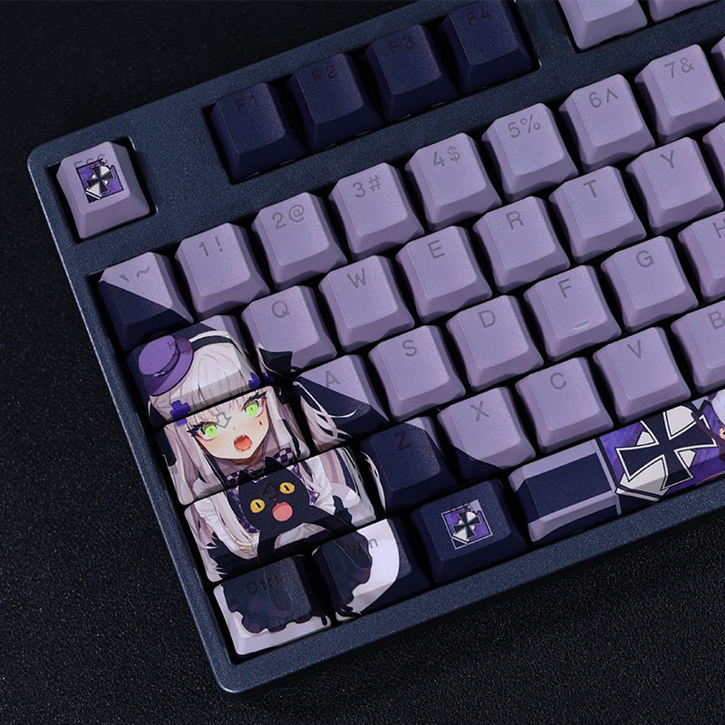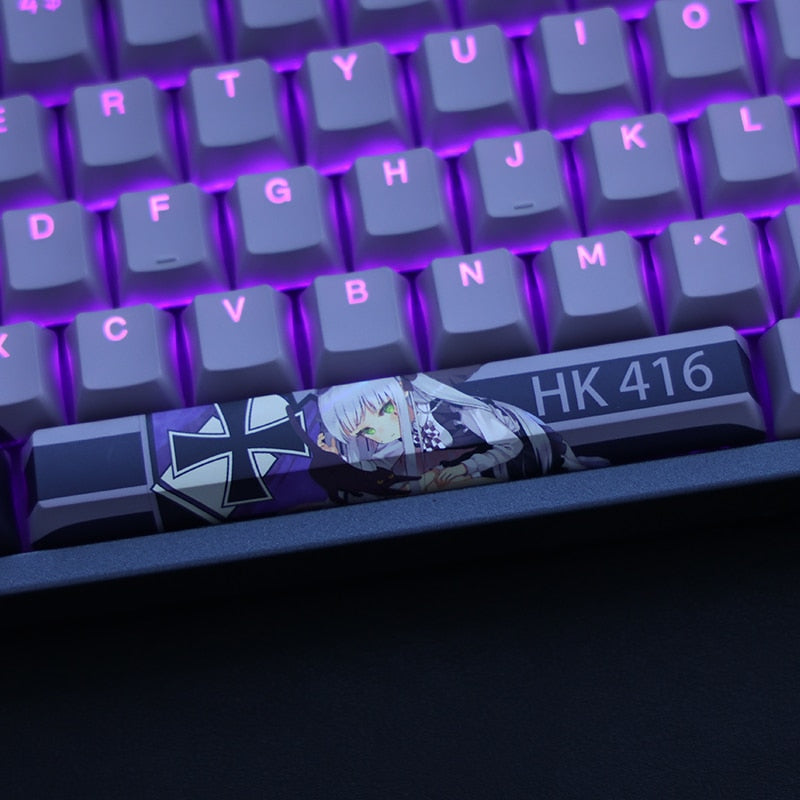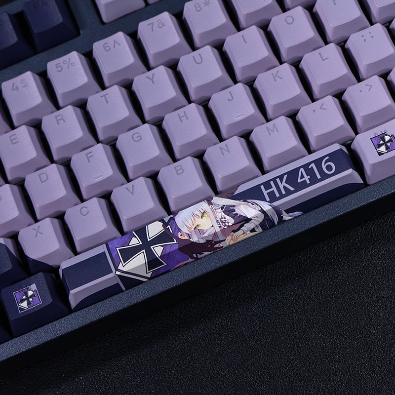 This mechanical keycaps set features various prints of HK416 from the Game "Girls' Frontline" that are bound together with purple and black colouring, combined with Backlit keycaps, HK416 illuminates when LEDs pass through the keycaps.