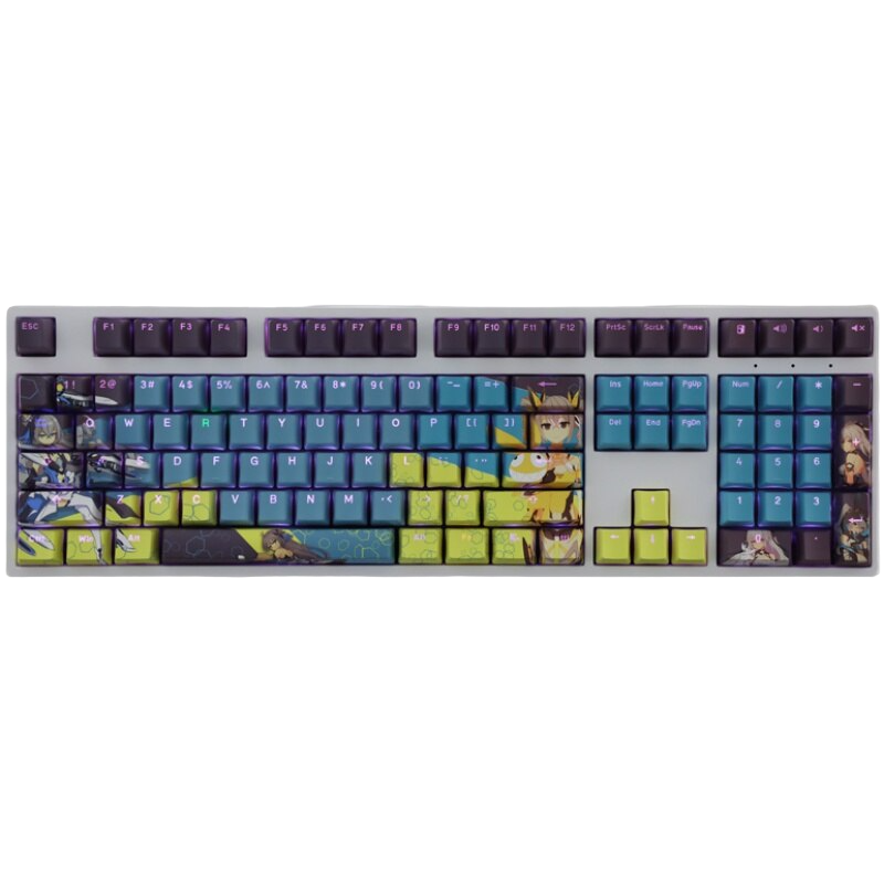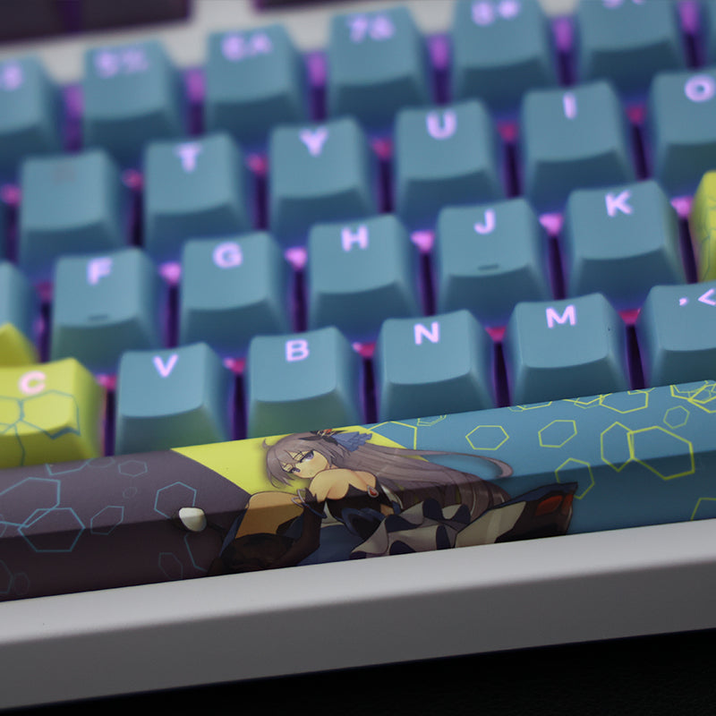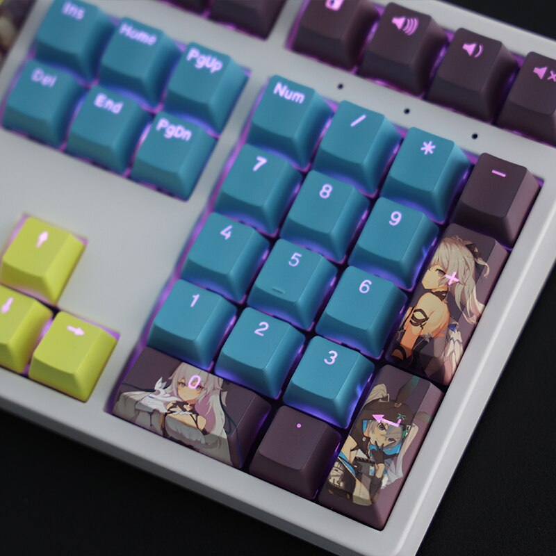 This mechanical keycaps set features various prints of Bronya Zaychik from the Game "Honkai" that are bound together with blue, green and black colouring, combined with Backlit keycaps, Bronya Zaychik illuminates when LEDs pass through the keycaps.