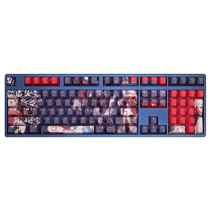 This mechanical keycaps set features various prints of Clara from the Game "Honkai" that are bound together with dark blue and red colouring, combined with Backlit keycaps, Clara illuminates when LEDs pass through the keycaps.
