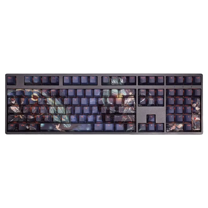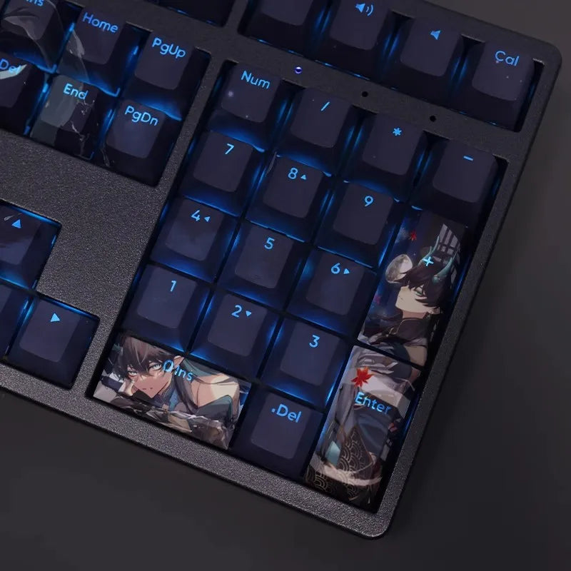 This mechanical keycaps set features various prints of Dan Feng from the Game "Honkai" that are bound together with dark blue colouring, combined with Backlit keycaps, Dan Feng illuminates when LEDs pass through the keycaps.
