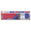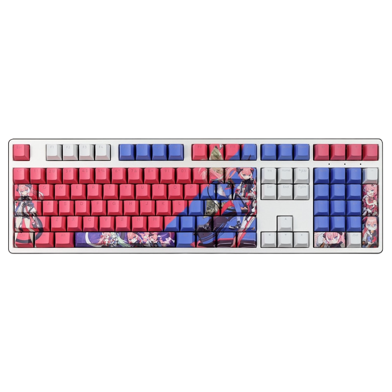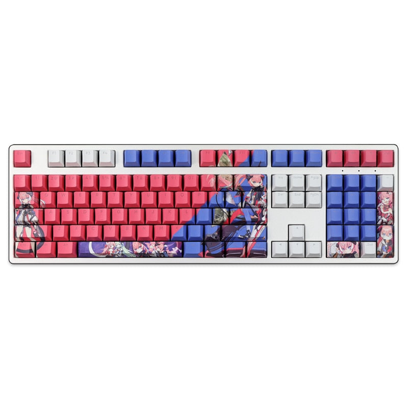 This mechanical keycaps set features various prints of Delta from the Game "Honkai" that are bound together with pink and blue colouring.