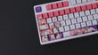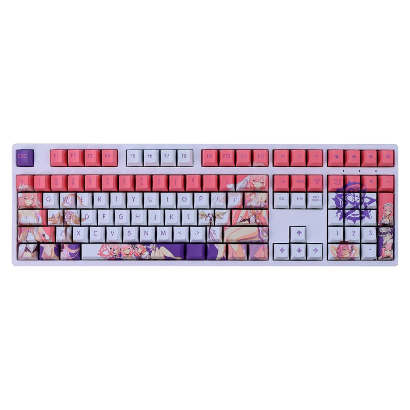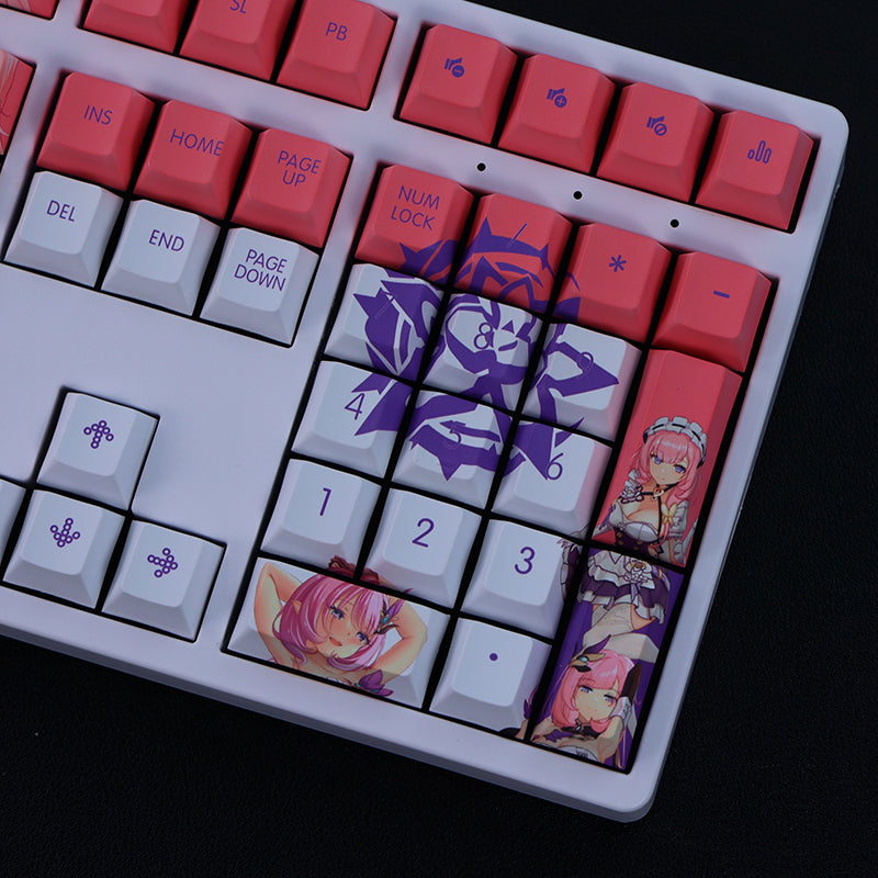 This mechanical keycaps set features various prints of Elysia from the Game "Honkai" that are bound together with white, pink and purple colouring.