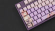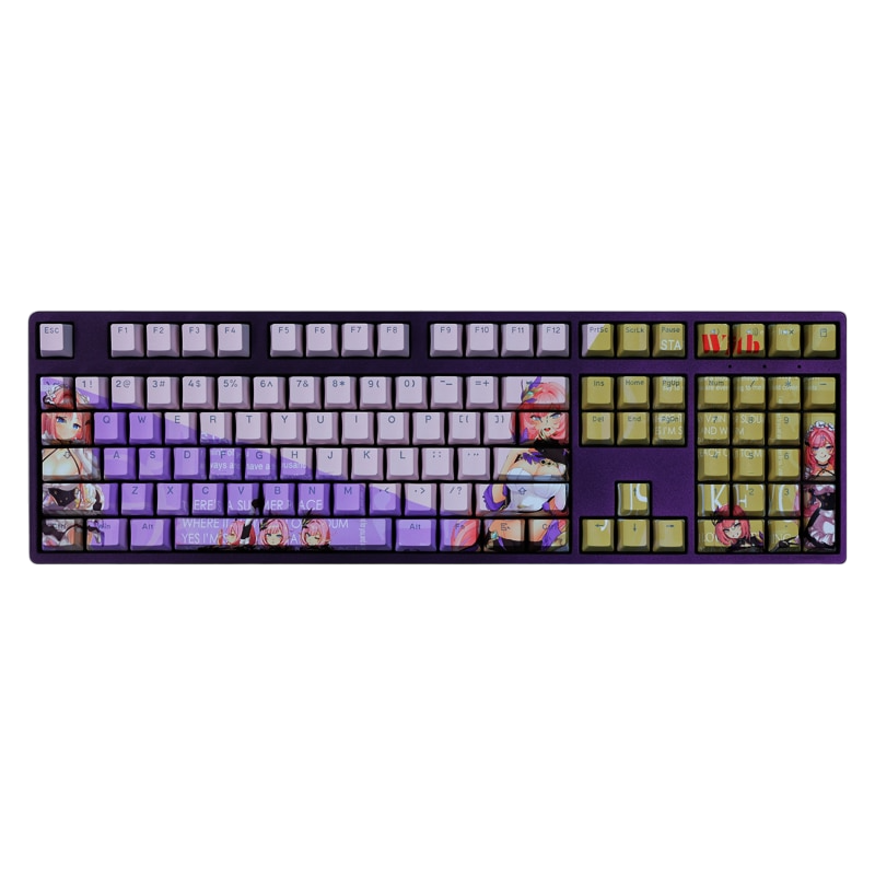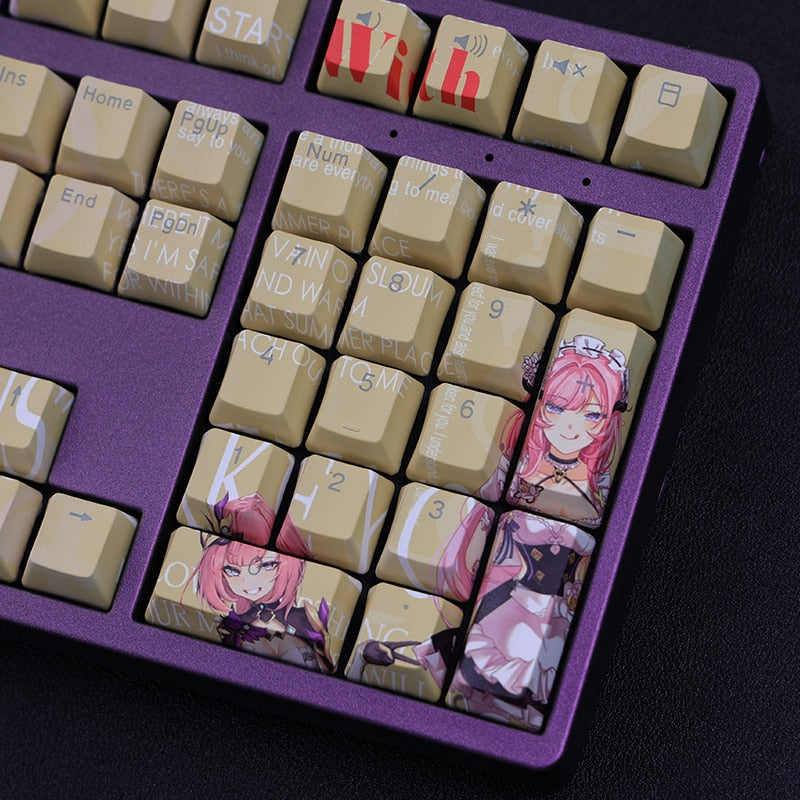 This mechanical keycaps set features various prints of Elysia from the Game "Honkai" that are bound together with yellow and purple colouring.