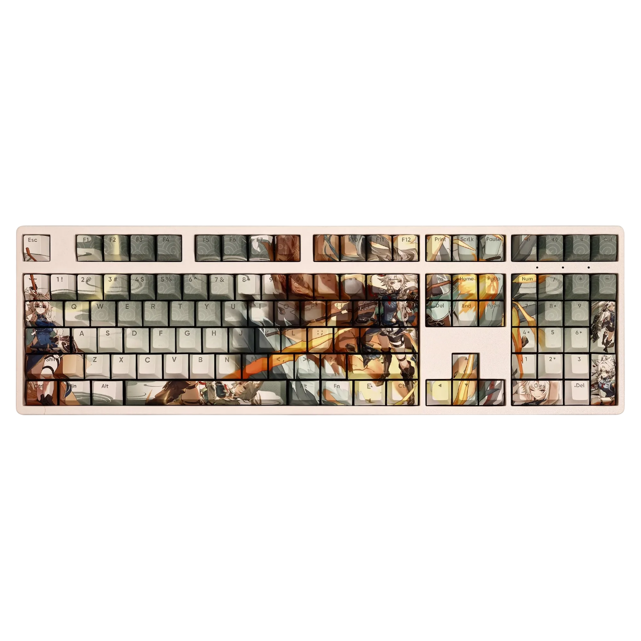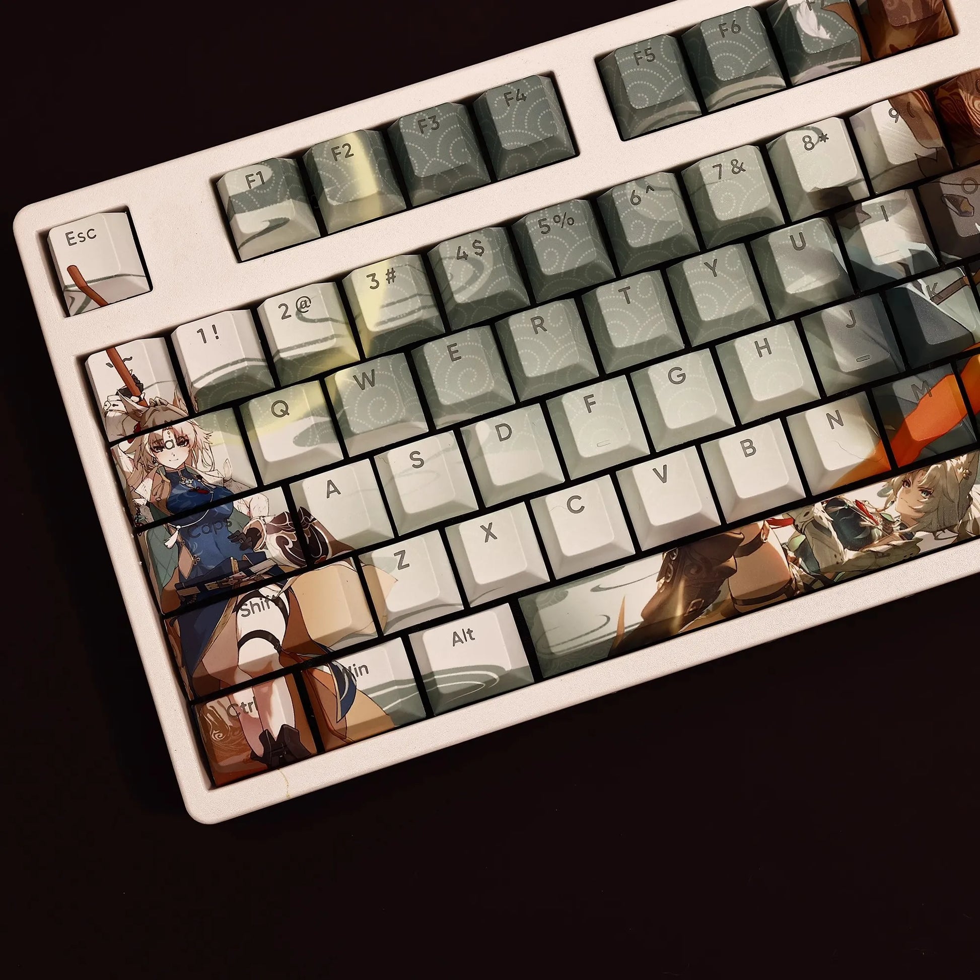 This mechanical keycaps set features various prints of Feixiao from the Game "Honkai" that are bound together with green and white colouring, combined with Backlit keycaps, Feixiao illuminates when LEDs pass through the keycaps.