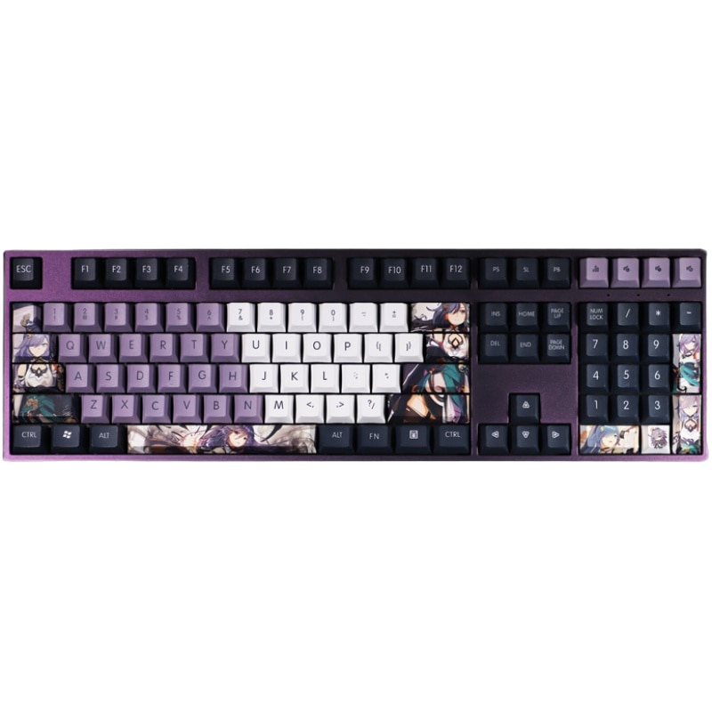 This mechanical keycaps set features various prints of Fu Hua from the Game "Honkai" that are bound together with black, white and purple colouring.