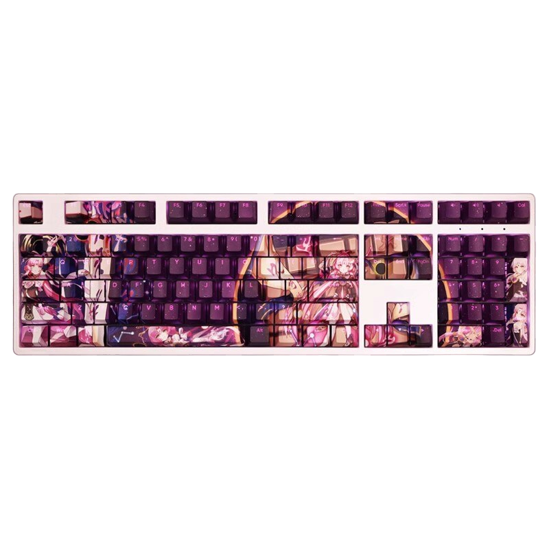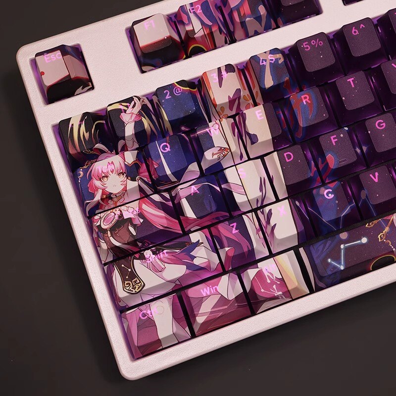 This mechanical keycaps set features various prints of Fu Xuan from the Game "Honkai" that are bound together with purple and pink colouring, combined with Backlit keycaps, Fu Xuan illuminates when LEDs pass through the keycaps.