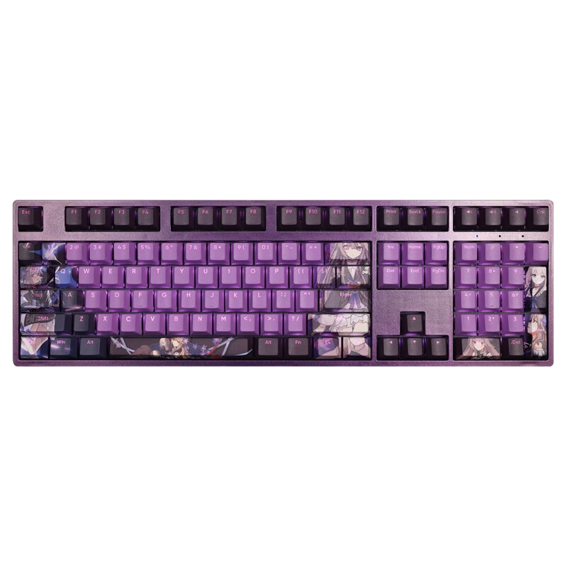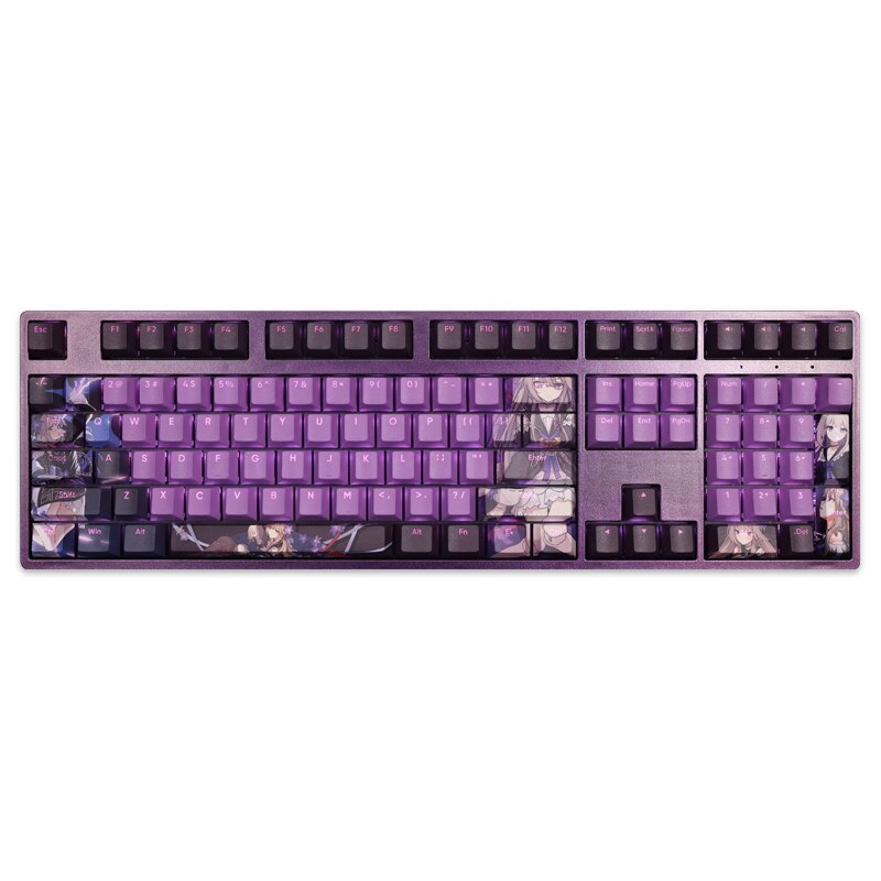 This mechanical keycaps set features various prints of Herta from the Game "Honkai" that are bound together with purple and black colouring, combined with Backlit keycaps, Herta illuminates when LEDs pass through the keycaps.