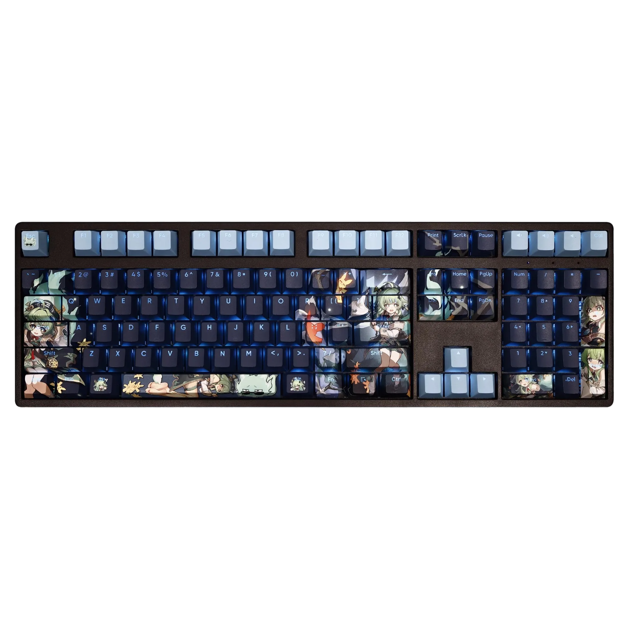 This mechanical keycaps set features various prints of HuoHuo from the Game "Honkai" that are bound together with dark blue and light blue colouring, combined with Backlit keycaps, HuoHuo illuminates when LEDs pass through the keycaps.