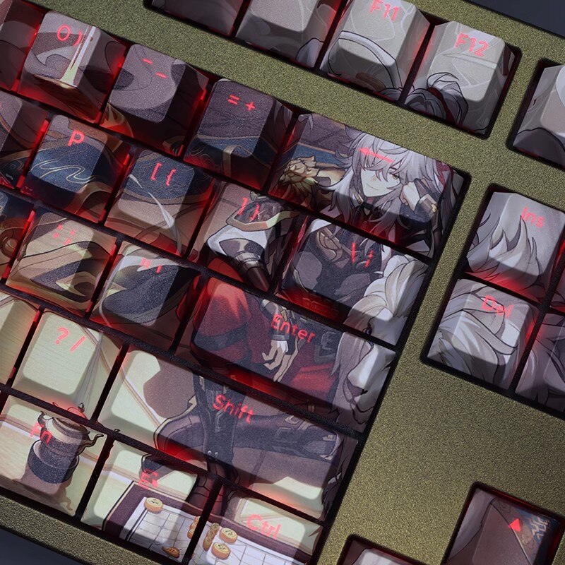 This mechanical keycaps set features various prints of Jing Yuan from the Game "Honkai" that are bound together with red and white colouring, combined with Backlit keycaps, Jing Yuan illuminates when LEDs pass through the keycaps.