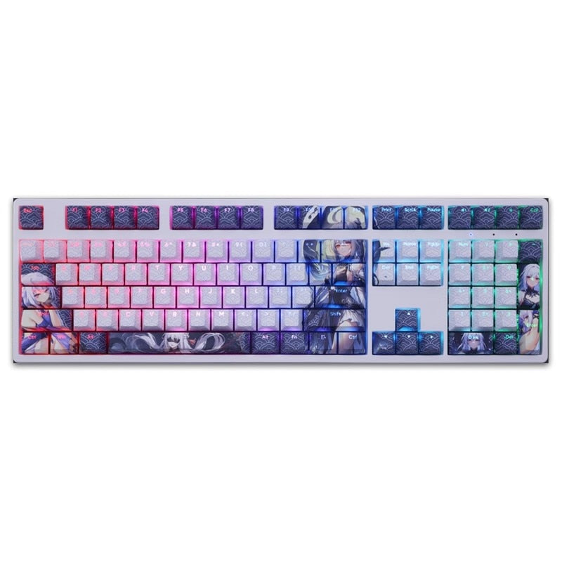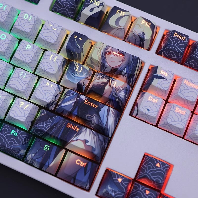 This mechanical keycaps set features various prints of Jingliu from the Game "Honkai" that are bound together with white and blue colouring, combined with Backlit keycaps, Jingliu illuminates when LEDs pass through the keycaps.