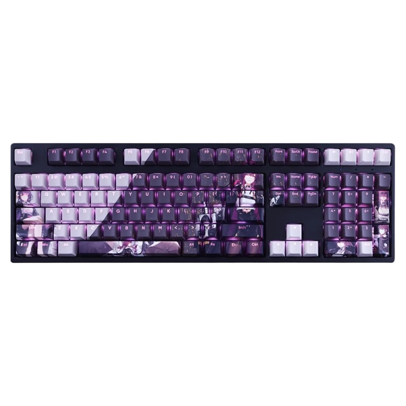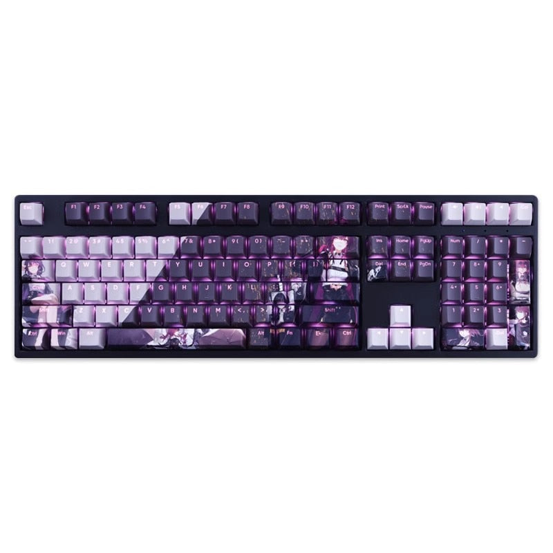 This mechanical keycaps set features various prints of Kafka from the Game "Honkai" that are bound together with white and purple colouring, combined with Backlit keycaps, Kafka illuminates when LEDs pass through the keycaps.