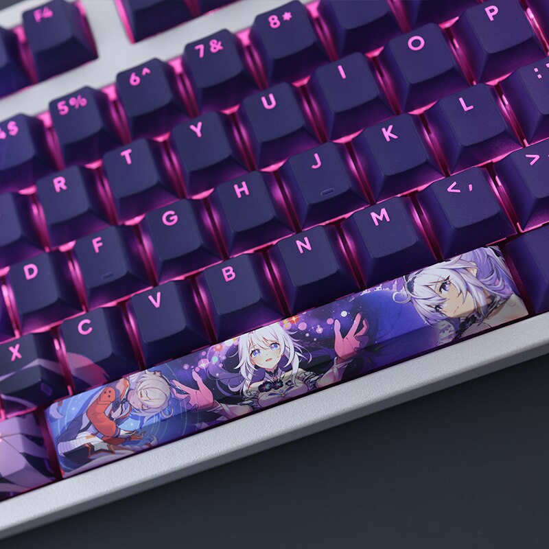 This mechanical keycaps set features various prints of Kiana Kaslana from the Game "Honkai" that are bound together with purple colouring, combined with Backlit keycaps, Kiana Kaslana illuminates when LEDs pass through the keycaps.