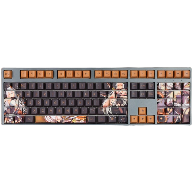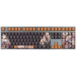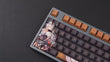 This mechanical keycaps set features various prints of Kiana Kaslana from the Game "Honkai" that are bound together with black and orange colouring.