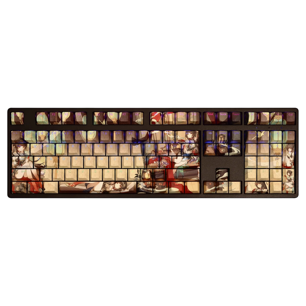This mechanical keycaps set features various prints of Lingsha from the Game "Honkai" that are bound together with cream colouring, combined with Backlit keycaps, Lingsha illuminates when LEDs pass through the keycaps.