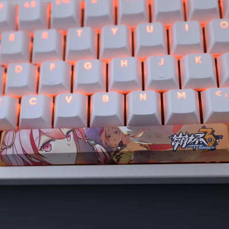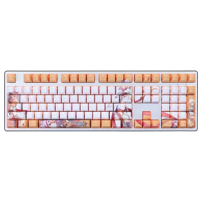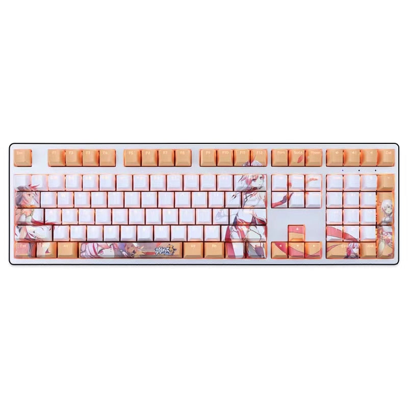 This mechanical keycaps set features various prints of Phoenix from the Game "Honkai" that are bound together with white and orange colouring, combined with Backlit keycaps, Phoenix illuminates when LEDs pass through the keycaps.
